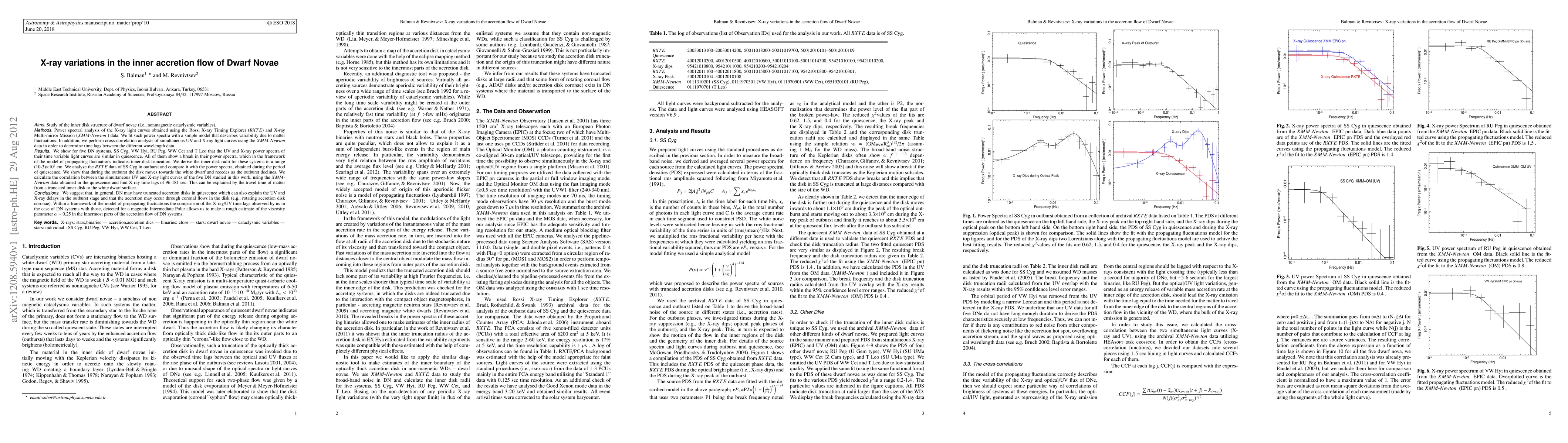 We show for five DN systems, SS Cyg, VW Hyi, RU Peg, WW Cet and T Leo that the UV and X-ray power spectra of their time variable light curves are similar in quiescence. All of them show a break in their power spectra, which in the framework of the model of propagating fluctuations indicates inner disk truncation. We derive the inner disk radii for these systems in a range (10-3)$\times10^{9}$ cm. We analyze the RXTE data of SS Cyg in outburst and compare it with the power spectra, obtained during the period of quiescence. We show that during the outburst the disk moves towards the white dwarf and recedes as the outburst declines. We calculate the correlation between the simultaneous UV and X-ray light curves of the five DN studied in this work, using the XMM-Newton data obtained in the quiescence and find X-ray time lags of 96-181 sec. This can be explained by the travel time of matter from a truncated inner disk to the white dwarf surface. We suggest that, in general, DN may have truncated accretion disks in quiescence which can also explain the UV and X-ray delays in the outburst stage and that the accretion may occur through coronal flows in the disk (e.g., rotating accretion disk coronae). Within a framework of the model of propagating fluctuations the comparison of the X-ray/UV time lags observed by us in the case of DN systems with those, detected for a magnetic Intermediate Polar allows us to make a rough estimate of the viscosity parameter $\alpha\sim0.25$ in the innermost parts of the accretion flow of DN systems.