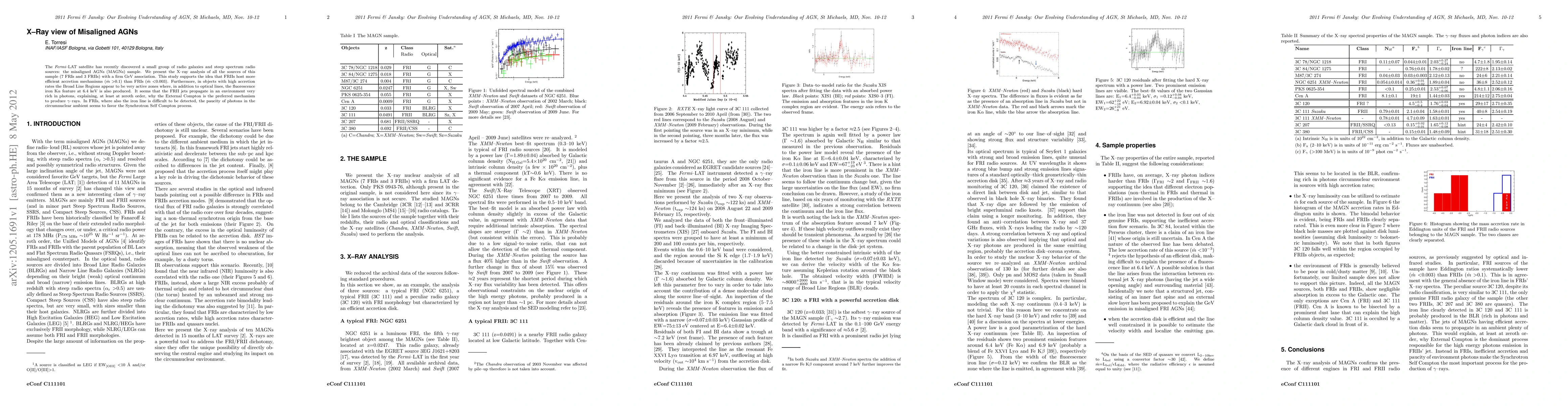 The Fermi-LAT satellite has recently discovered a small group of radio galaxies and steep spectrum radio sources: the misaligned AGNs (MAGNs) sample. We present the X-ray analysis of all the sources of this sample (7 FRIs and 3 FRIIs) with a firm GeV association. This study supports the idea that FRIIs host more efficient accretion mechanisms (m_dot >0.1) than FRIs (m_dot <0.003). Furthermore, in objects with high accretion rates the Broad Line Regions appear to be very active zones where, in addition to optical lines, the fluorescence iron Kalpha feature at 6.4 keV is also produced. It seems that the FRII jets propagate in an environment very rich in photons, explaining, at least at zeroth order, why the External Compton is the preferred mechanism to produce gamma-rays. In FRIs, where also the iron line is difficult to be detected, the paucity of photons in the circumnuclear ambient seems to favor the Synchrotron Self Compton process.