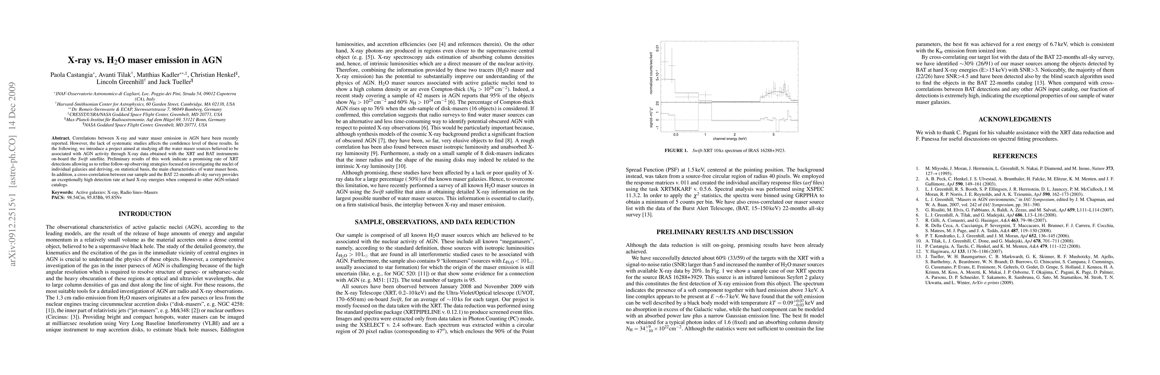 This study investigates the correlation between X-ray and water maser emissions in Active Galactic Nuclei (AGN) using data from Swift satellite's XRT and BAT instruments. Preliminary findings show a high detection rate of XRT sources, suggesting refined observing strategies for detailed AGN nuclei analysis and statistical characterization of water maser hosts.