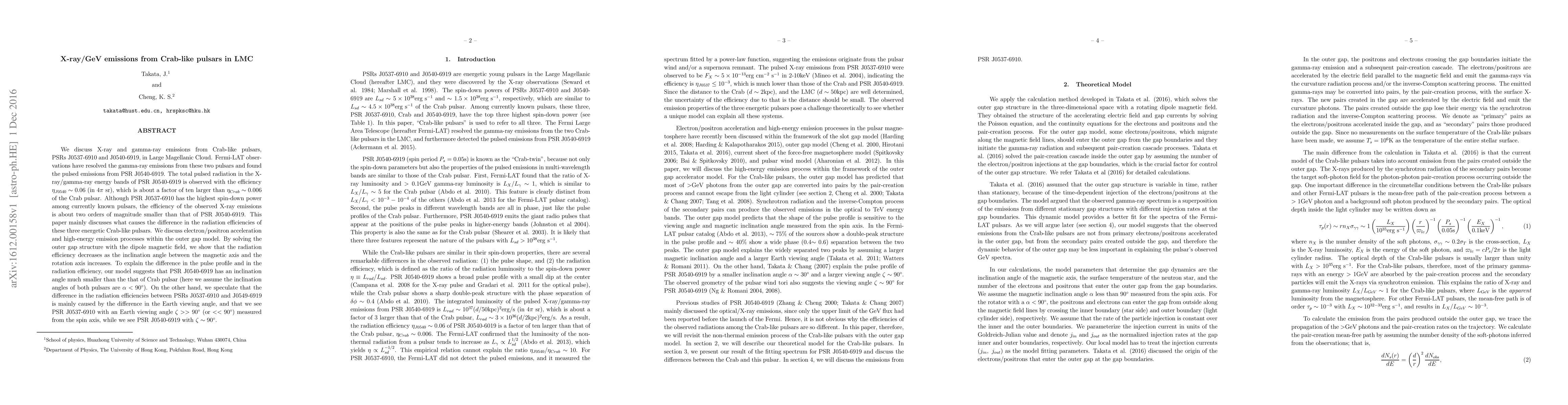Researchers studied X-ray and gamma-ray emissions from two Crab-like pulsars in the Large Magellanic Cloud, finding that one has a significantly higher efficiency than the others, and proposed that this difference may be due to variations in viewing angles.