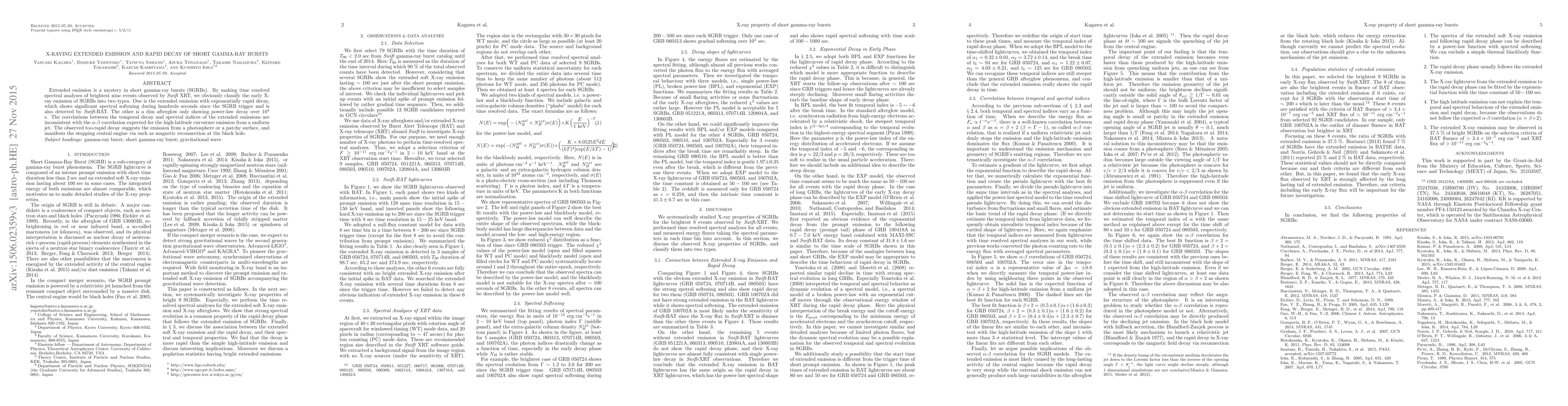 Extended emission is a mystery in short gamma-ray bursts (SGRBs). By making time resolved spectral analyses of brightest nine events observed by ${\it Swift}$ XRT, we obviously classify the early X-ray emission of SGRBs into two types. One is the extended emission with exponentially rapid decay, which shows significant spectral softening during hundreds seconds since the SGRB trigger and is also detected by ${\it Swift}$-BAT. The other is a dim afterglow only showing power-law decay over $10^4$ s. The correlations between the temporal decay and spectral indices of the extended emissions are inconsistent with the $\alpha$-$\beta$ correlation expected for the high-latitude curvature emission from a uniform jet. The observed too-rapid decay suggests the emission from a photosphere or a patchy surface, and manifests the stopping central engine via such as magnetic reconnection at the black hole.
