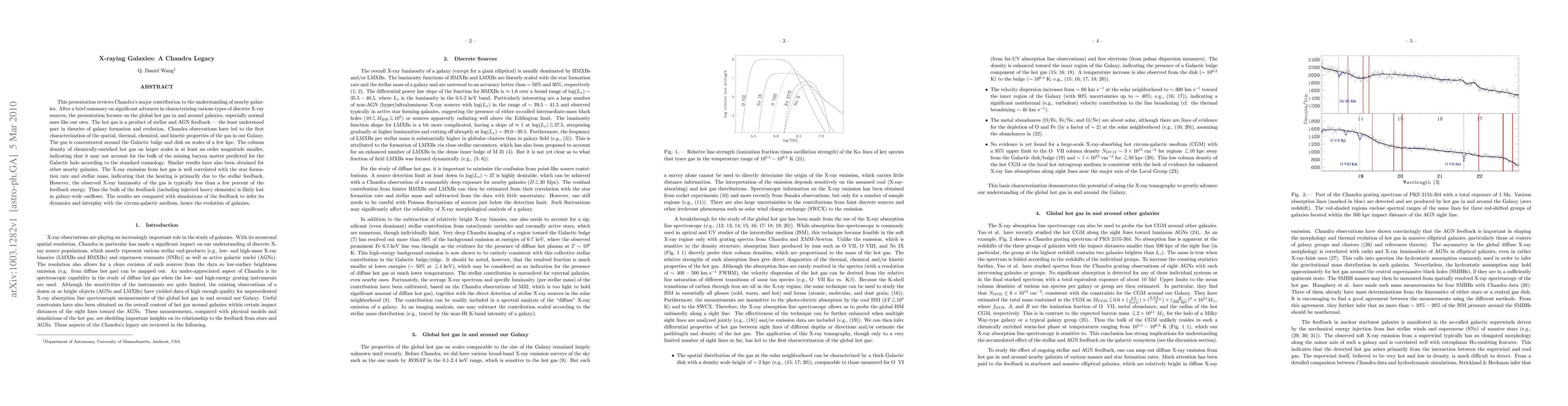 This presentation reviews Chandra's major contribution to the understanding of nearby galaxies. After a brief summary on significant advances in characterizing various types of discrete X-ray sources, the presentation focuses on the global hot gas in and around galaxies, especially normal ones like our own. The hot gas is a product of stellar and AGN feedback -- the least understood part in theories of galaxy formation and evolution. Chandra observations have led to the first characterization of the spatial, thermal, chemical, and kinetic properties of the gas in our Galaxy. The gas is concentrated around the Galactic bulge and disk on scales of a few kpc. The column density of chemically-enriched hot gas on larger scales is at least an order magnitude smaller, indicating that it may not account for the bulk of the missing baryon matter predicted for the Galactic halo according to the standard cosmology. Similar results have also been obtained for other nearby galaxies. The X-ray emission from hot gas is well correlated with the star formation rate and stellar mass, indicating that the heating is primarily due to the stellar feedback. However, the observed X-ray luminosity of the gas is typically less than a few percent of the feedback energy. Thus the bulk of the feedback (including injected heavy elements) is likely lost in galaxy-wide outflows. The results are compared with simulations of the feedback to infer its dynamics and interplay with the circum-galactic medium, hence the evolution of galaxies.