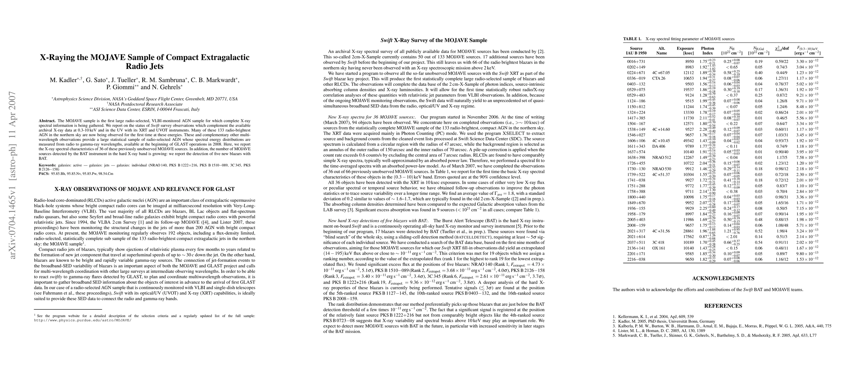 The MOJAVE sample is the first large radio-selected, VLBI-monitored AGN sample for which complete X-ray spectral information is being gathered. We report on the status of Swift survey observations which complement the available archival X-ray data at 0.3-10 keV and in the UV with its XRT and UVOT instruments. Many of these 133 radio-brightest AGN in the northern sky are now being observed for the first time at these energies. These and complementary other multi-wavelength observations provide a large statistical sample of radio-selected AGN whose spectral energy distributions are measured from radio to gamma-ray wavelengths, available at the beginning of GLAST operations in 2008. Here, we report the X-ray spectral characteristics of 36 of these previously unobserved MOJAVE sources. In addition, the number of MOJAVE sources detected by the BAT instrument in the hard X-ray band is growing: we report the detection of five new blazars with BAT.