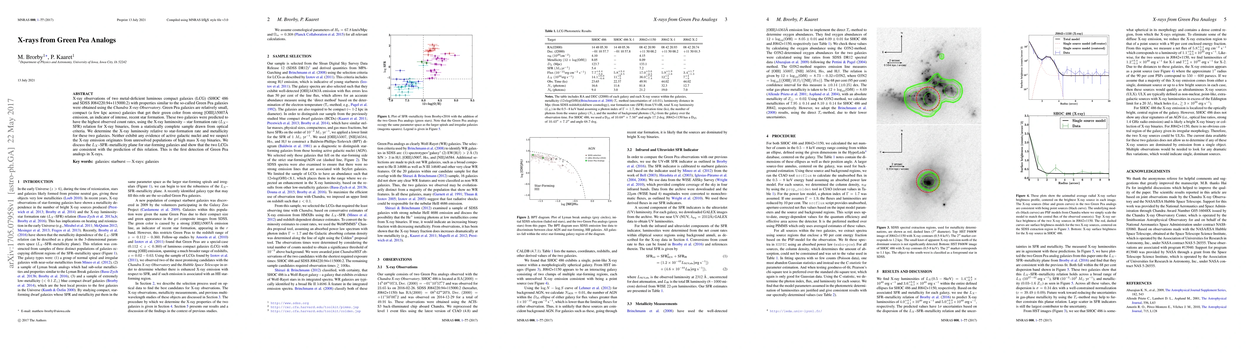 X-ray observations of two metal-deficient luminous compact galaxies (LCG) (SHOC~486 and SDSS J084220.94+115000.2) with properties similar to the so-called Green Pea galaxies were obtained using the {\emph{Chandra X-ray Observatory}}. Green Pea galaxies are relatively small, compact (a few kpc across) galaxies that get their green color from strong [OIII]$\lambda$5007\AA\ emission, an indicator of intense, recent star formation. These two galaxies were predicted to have the highest observed count rates, using the X-ray luminosity -- star formation rate ($L_X$--SFR) relation for X-ray binaries, from a statistically complete sample drawn from optical criteria. We determine the X-ray luminosity relative to star-formation rate and metallicity for these two galaxies. Neither exhibit any evidence of active galactic nuclei and we suspect the X-ray emission originates from unresolved populations of high mass X-ray binaries. We discuss the $L_X$--SFR--metallicity plane for star-forming galaxies and show that the two LCGs are consistent with the prediction of this relation. This is the first detection of Green Pea analogs in X-rays.