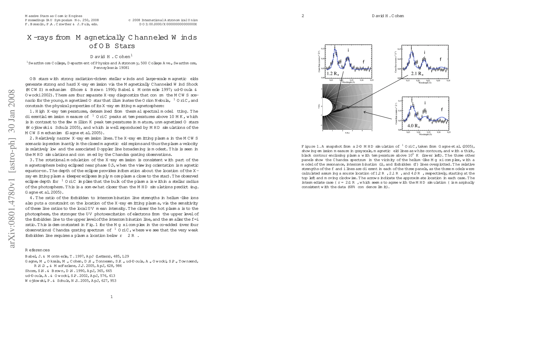 OB stars with strong radiation-driven stellar winds and large-scale magnetic fields generate strong and hard X-ray emission via the Magnetically Channeled Wind Shock (MCWS) mechanism. In this brief paper, I describe four separate X-ray diagnostics of the MCWS mechanism in OB stars, with applications to the prototype young O star, theta-1 Ori C.