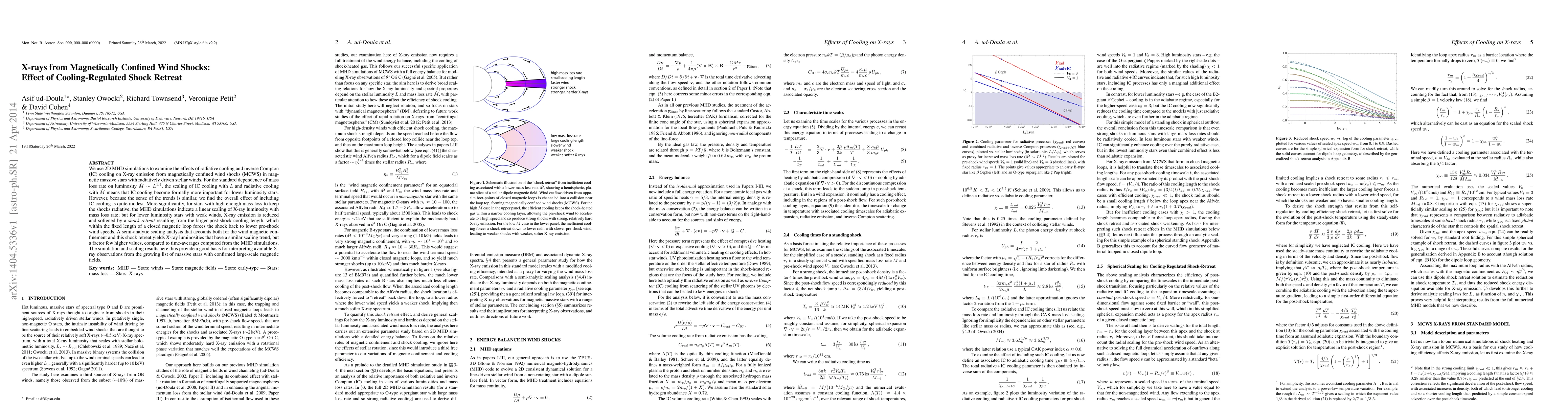 This paper uses 2D MHD simulations to study X-ray emission from magnetically confined wind shocks in massive stars, finding that radiative cooling and inverse Compton cooling have modest effects on X-ray luminosity. For stars with high mass loss, X-ray luminosity scales linearly with mass loss rate, but lower luminosity stars experience reduced X-ray emission due to shock retreat caused by increased post-shock cooling length.