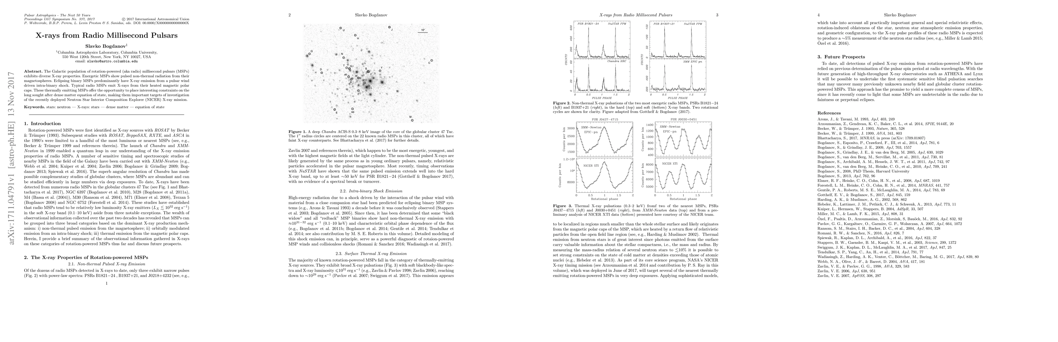 The Galactic population of rotation-powered (aka radio) millisecond pulsars (MSPs) exhibits diverse X-ray properties. Energetic MSPs show pulsed non-thermal radiation from their magnetospheres. Eclipsing binary MSPs predominantly have X-ray emission from a pulsar wind driven intra-binary shock. Typical radio MSPs emit X-rays from their heated magnetic polar caps. These thermally emitting MSPs offer the opportunity to place interesting constraints on the long sought after dense matter equation of state, making them important targets of investigation of the recently deployed Neutron Star Interior Composition Explorer (NICER) X-ray mission.