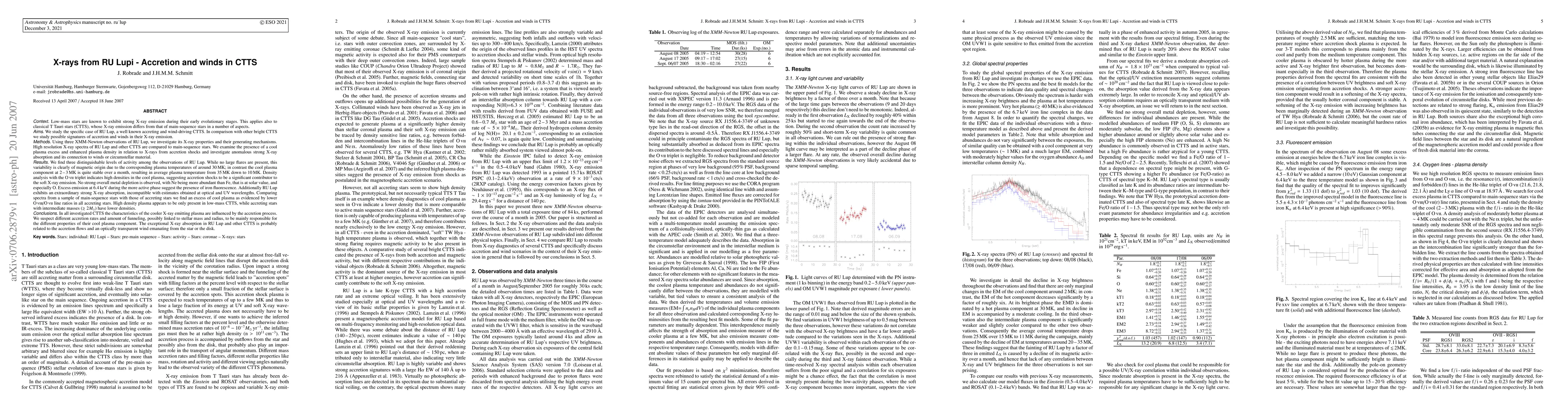 Using three XMM-Newton observations we study the X-ray emission of RU Lup, a accreting and wind-driving CTTS. In comparison with other bright CTTS we study possible signatures of accretion and winds in their X-ray emission. Results: We find three levels of activity among the observations of RU Lup, clearly of magnetic origin due to the corresponding high plasma temperatures. Density analysis with the OVII triplet indicates high densities in the cool plasma, suggesting accretion shocks to be a significant contributor to the soft X-ray emission. No strong overall metal depletion is observed. Excess emission at 6.4 keV during the more active phase suggest the presence of iron fluorescence. In accreting stars we find an excess of cool plasma as evidenced by lower OVIII/OVII line ratios compared to main-sequence stars. High density plasma appears to be only present in low-mass CTTS, while accreting stars with intermediate masses (> 2 M_Sun) have lower densities. Conclusions: In all investigated CTTS the characteristics of the cooler X-ray emitting plasma are influenced by the accretion process. We suspect different accretion rates and amount of funneling, possibly linked to stellar mass and radius, to be mainly responsible for the different properties of their cool plasma component. The exceptional strong X-ray absorption in RU Lup and other CTTS is probably related to accretion flows and an optically transparent wind emanating from the star or the disk.