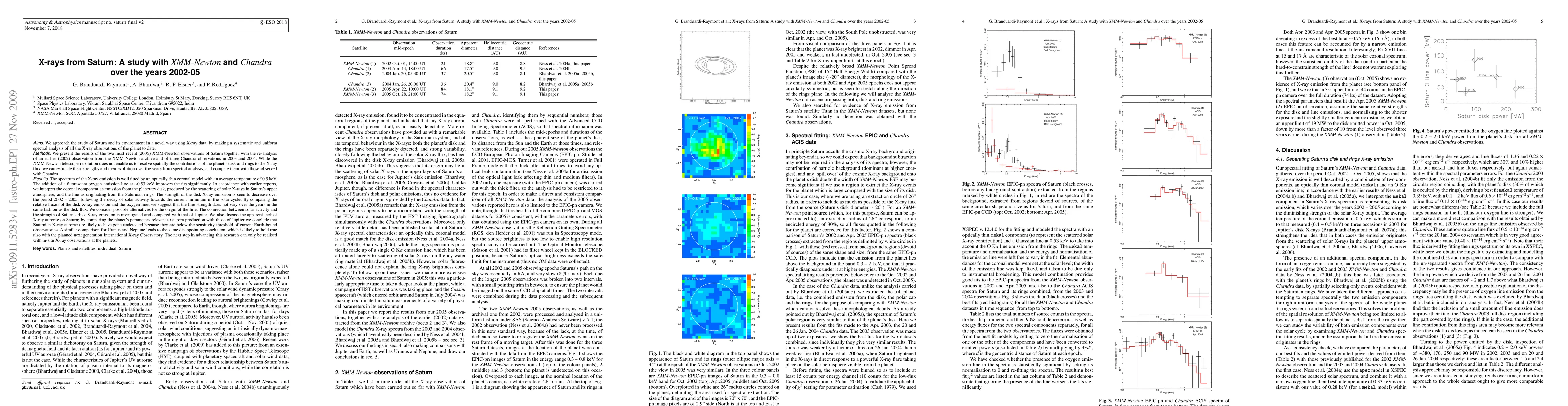 We present the results of the two most recent (2005) XMM-Newton observations of Saturn together with the re-analysis of an earlier (2002) observation from the XMM-Newton archive and of three Chandra observations in 2003 and 2004. While the XMM-Newton telescope resolution does not enable us to resolve spatially the contributions of the planet's disk and rings to the X-ray flux, we can estimate their strengths and their evolution over the years from spectral analysis, and compare them with those observed with Chandra. The spectrum of the X-ray emission is well fitted by an optically thin coronal model with an average temperature of 0.5 keV. The addition of a fluorescent oxygen emission line at ~0.53 keV improves the fits significantly. In accordance with earlier reports, we interpret the coronal component as emission from the planetary disk, produced by the scattering of solar X-rays in Saturn's upper atmosphere, and the line as originating from the Saturnian rings. The strength of the disk X-ray emission is seen to decrease over the period 2002 - 2005, following the decay of solar activity towards the current minimum in the solar cycle. By comparing the relative fluxes of the disk X-ray emission and the oxygen line, we suggest that the line strength does not vary over the years in the same fashion as the disk flux. We consider possible alternatives for the origin of the line. The connection between solar activity and the strength of Saturn's disk X-ray emission is investigated and compared with that of Jupiter. We also discuss the apparent lack of X-ray aurorae on Saturn and conclude that they are likely to lie below the sensitivity threshold of current Earth-bound observatories. A similar comparison for Uranus and Neptune leads to the same disappointing conclusion.