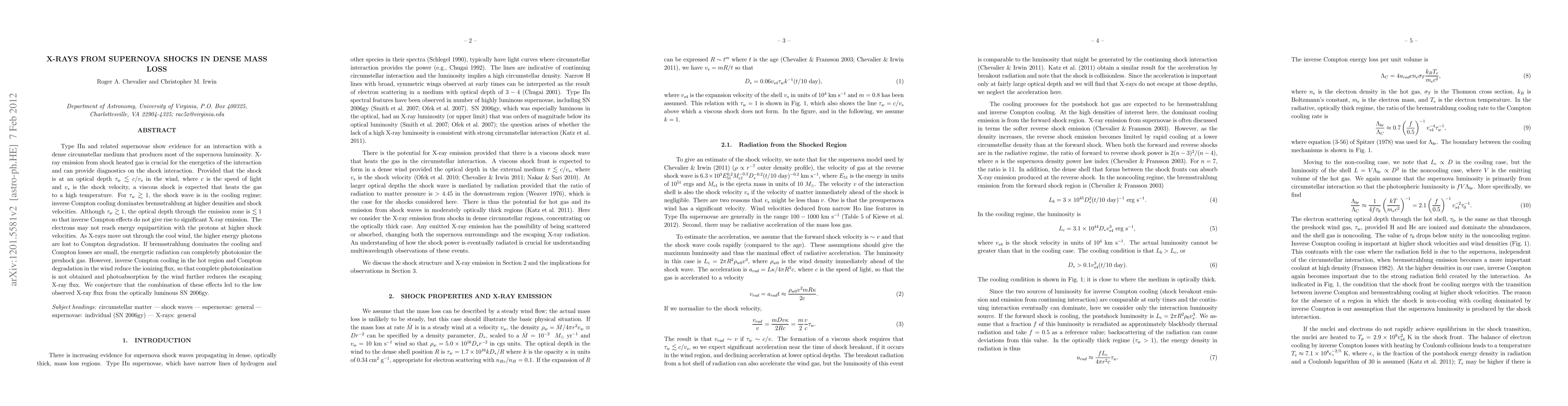 Type IIn and related supernovae show evidence for an interaction with a dense circumstellar medium that produces most of the supernova luminosity. X-ray emission from shock heated gas is crucial for the energetics of the interaction and can provide diagnostics on the shock interaction. Provided that the shock is at an optical depth tau_w\la c/v_s in the wind, where c is the speed of light and v_s is the shock velocity, a viscous shock is expected that heats the gas to a high temperature. For tau_w\ga 1, the shock wave is in the cooling regime; inverse Compton cooling dominates bremsstrahlung at higher densities and shock velocities. Although tau_w\ga 1, the optical depth through the emission zone is \la 1 so that inverse Compton effects do not give rise to significant X-ray emission. The electrons may not reach energy equipartition with the protons at higher shock velocities. As X-rays move out through the cool wind, the higher energy photons are lost to Compton degradation. If bremsstrahlung dominates the cooling and Compton losses are small, the energetic radiation can completely photoionize the preshock gas. However, inverse Compton cooling in the hot region and Compton degradation in the wind reduce the ionizing flux, so that complete photoionization is not obtained and photoabsorption by the wind further reduces the escaping X-ray flux. We conjecture that the combination of these effects led to the low observed X-ray flux from the optically luminous SN 2006gy.
