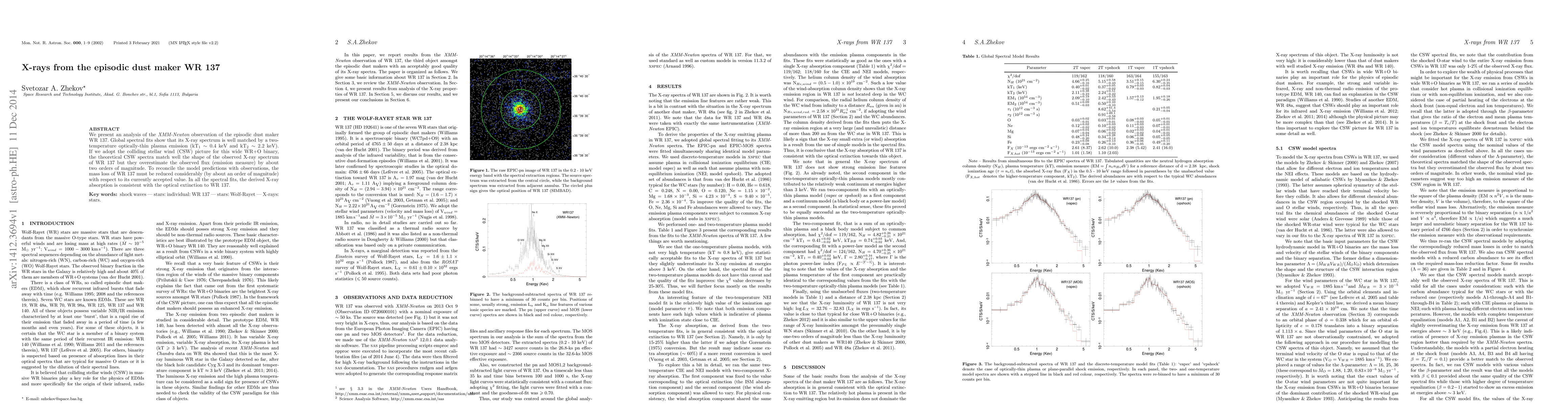 We present an analysis of the XMM-Newton observation of the episodic dust maker WR 137. Global spectral fits show that its X-ray spectrum is well matched by a two-temperature optically-thin plasma emission (kT_1 ~ 0.4 keV and kT_2 ~ 2.2 keV). If we adopt the colliding stellar wind (CSW) picture for this wide WR+O binary, the theoretical CSW spectra match well the shape of the observed X-ray spectrum of WR 137 but they overestimate the observed flux (emission measure) by about two orders of magnitude. To reconcile the model predictions with observations, the mass loss of \WR must be reduced considerably (by about an order of magnitude) with respect to its currently accepted value. In all the spectral fits, the derived X-ray absorption is consistent with the optical extinction to WR 137.
