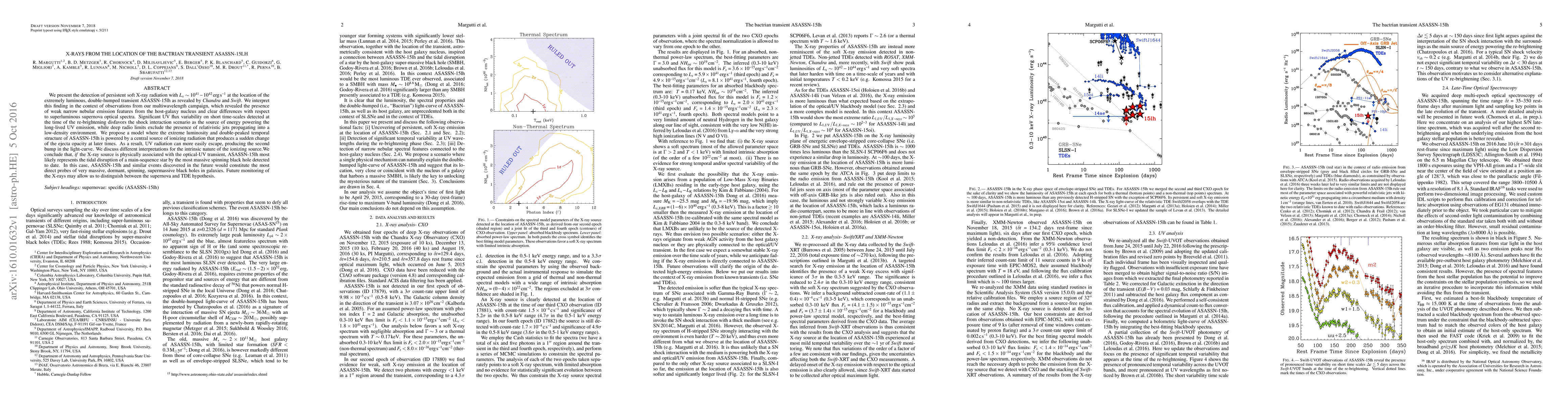 The paper reports persistent soft X-ray radiation detected at the location of the transient ASASSN-15lh, suggesting it is powered by a central ionizing source. The authors propose that ASASSN-15lh likely represents the tidal disruption of a star by a massive spinning black hole, offering a probe for studying such supermassive black holes.