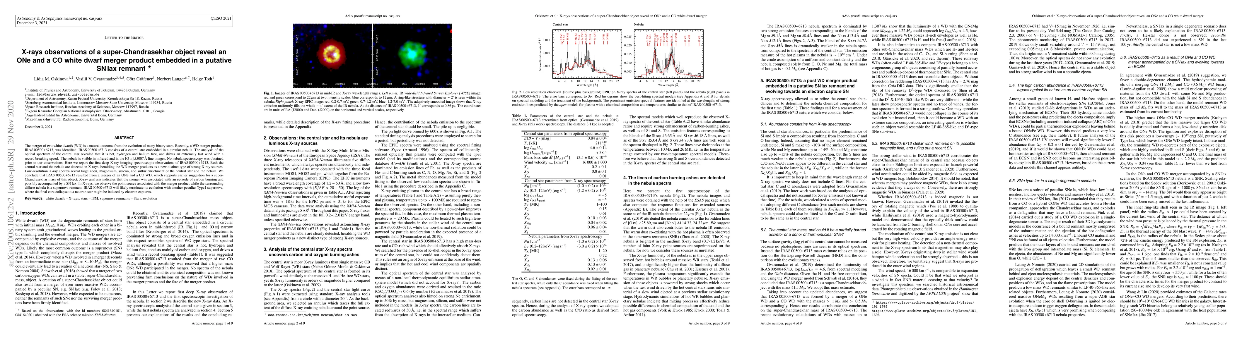 The merger of two white dwarfs (WD) is a natural outcome from the evolution of many binary stars. Recently, a WD merger product, IRAS 00500+6713, was identified. IRAS 00500+6713 consists of a central star embedded in a circular nebula. The analysis of the optical spectrum of the central star revealed that it is hot, hydrogen and helium free, and drives an extremely fast wind with a record breaking speed. The nebula is visible in infrared and in the [O III] line images. No nebula spectroscopy was obtained prior to our observations. Here we report the first deep X-ray imaging spectroscopic observations of IRAS 00500+6713. Both the central star and the nebula are detected in X-rays, heralding the WD merger products as a new distinct type of strong X-ray sources. Low-resolution X-ray spectra reveal large neon, magnesium, silicon, and sulfur enrichment of the central star and the nebula. We conclude that IRAS 00500+6713 resulted from a merger of an ONe and a CO WD, which supports earlier suggestion for a super-Chandrasekhar mass of this object. X-ray analysis indicates that the merger was associated with an episode of carbon burning and possibly accompanied by a SN Iax. In X-rays, we observe the point source associated with the merger product while the surrounding diffuse nebula is a supernova remnant. IRAS 00500+6713 will likely terminate its evolution with another peculiar Type I supernova, where the final core collapse to a neutron star might be induced by electron captures.