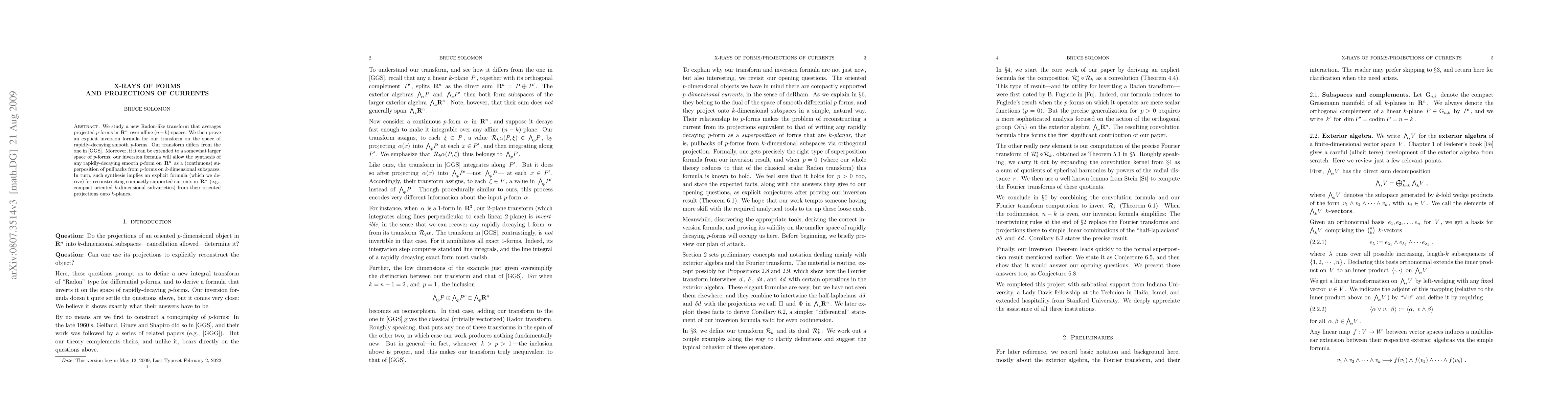 We introduce and study a new Radon-like transform that averages projected differential p-forms in R^n over affine (n-k)-planes. We then prove an explicit inversion formula for our transform on the space of rapidly-decaying smooth p-forms. Our transform differs from the one in Gelfand-Graev-Shapiro. Moreover, if it can be extended to a somewhat larger space of p-forms, our inversion formula will allow the synthesis of any rapidly-decaying smooth p-form on R^n as a (continuous) superposition of pullbacks from p-forms on k-dimensional subspaces. In turn, such synthesis implies an explicit formula (which we derive) for reconstructing compactly supported currents in R^n (e.g., compact oriented k-dimensional subvarieties) from their oriented projections onto k-planes.