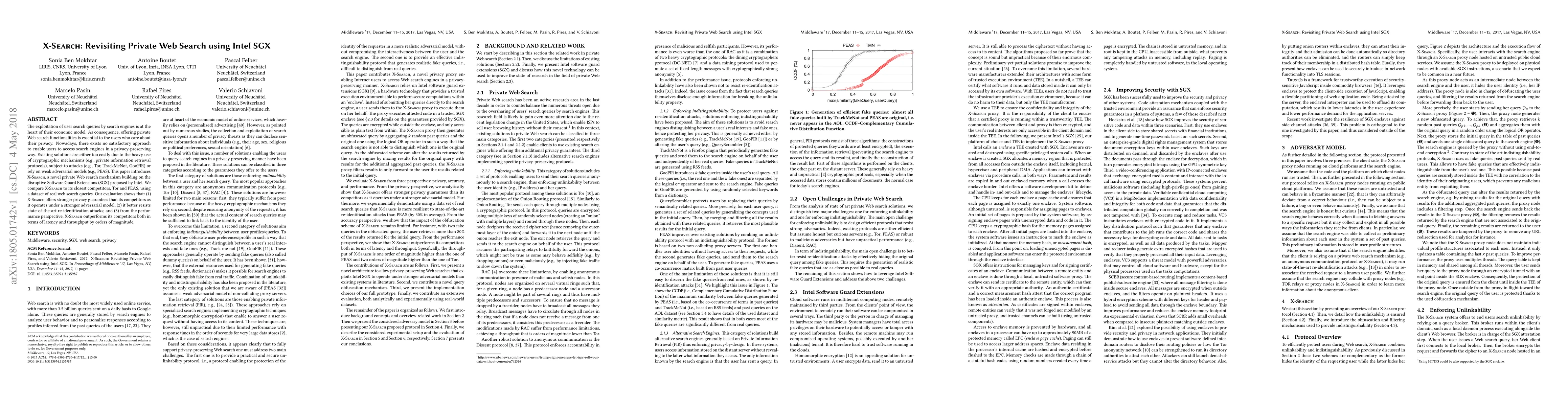 X-Search leverages Intel SGX to provide a private web search mechanism with stronger privacy guarantees and better resistance to re-identification attacks compared to Tor and PEAS, while also significantly outperforming them in terms of latency and throughput.