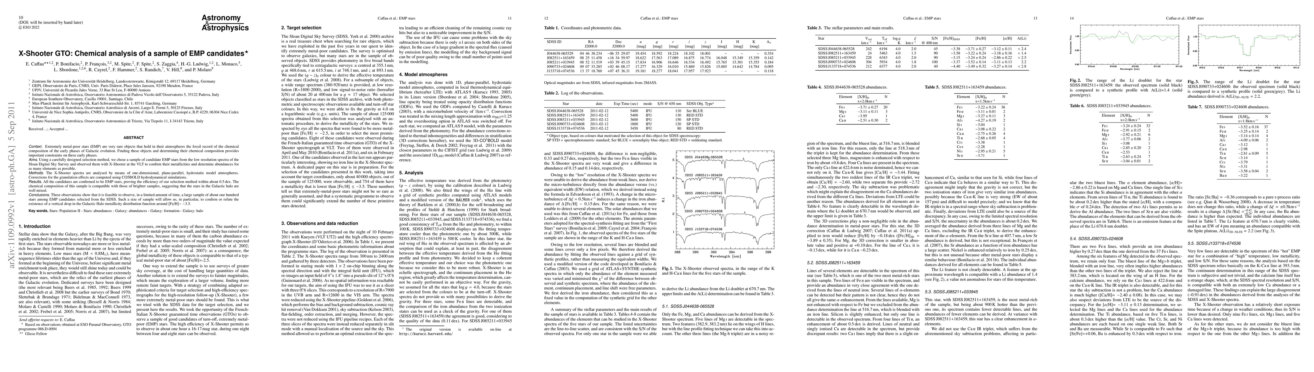 Context: Extremely metal-poor stars (EMP) are very rare objects that hold in their atmospheres the fossil record of the chemical composition of the early phases of Galactic evolution. Finding these objects and determining their chemical composition provides important constraints on these early phases. Aims: Using a carefully designed selection method, we chose a sample of candidate EMP stars from the low resolution spectra of the Sloan Digital Sky Survey and observed them with X-Shooter at the VLT to confirm their metallicities and determine abundances for as many elements as possible. Method: The X-Shooter spectra are analysed by means of one-dimensional, plane-parallel, hydrostatic model atmospheres. Corrections for the granulation effects are computed using CO5BOLD hydrodynamical simulations. Results: All the candidates are confirmed to be EMP stars, proving the efficiency of our selection method within about 0.5 dex. The chemical composition of this sample is compatible with those of brighter samples, suggesting that the stars in the Galactic halo are well mixed. Conclusions These observations show that it is feasible to observe, in a limited amount of time, a large sample of about one hundred stars among EMP candidates selected from the SDSS. Such a size of sample will allow us, in particular, to confirm or refute the existence of a vertical drop in the Galactic Halo metallicity distribution function around [Fe/H] ~ -3.5.