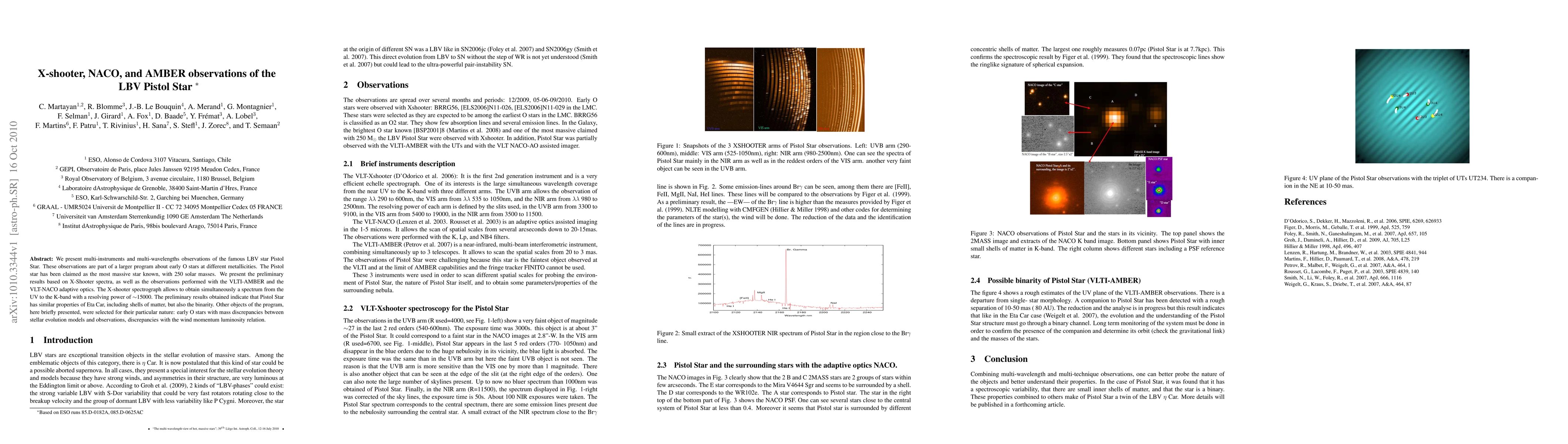 We present multi-instruments and multi-wavelengths observations of the famous LBV star Pistol Star. These observations are part of a larger program about early O stars at different metallicities. The Pistol star has been claimed as the most massive star known, with 250 solar masses. We present the preliminary results based on X-Shooter spectra, as well as the observations performed with the VLTI-AMBER and the VLT-NACO adaptive optics. The X-shooter spectrograph allows to obtain simultaneously a spectrum from the UV to the K-band with a resolving power of $\sim$15000. The preliminary results obtained indicate that Pistol Star has similar properties of Eta Car, including shells of matter, but also the binarity. Other objects of the program, here briefly presented, were selected for their particular nature: early O stars with mass discrepancies between stellar evolution models and observations, discrepancies with the wind momentum luminosity relation.