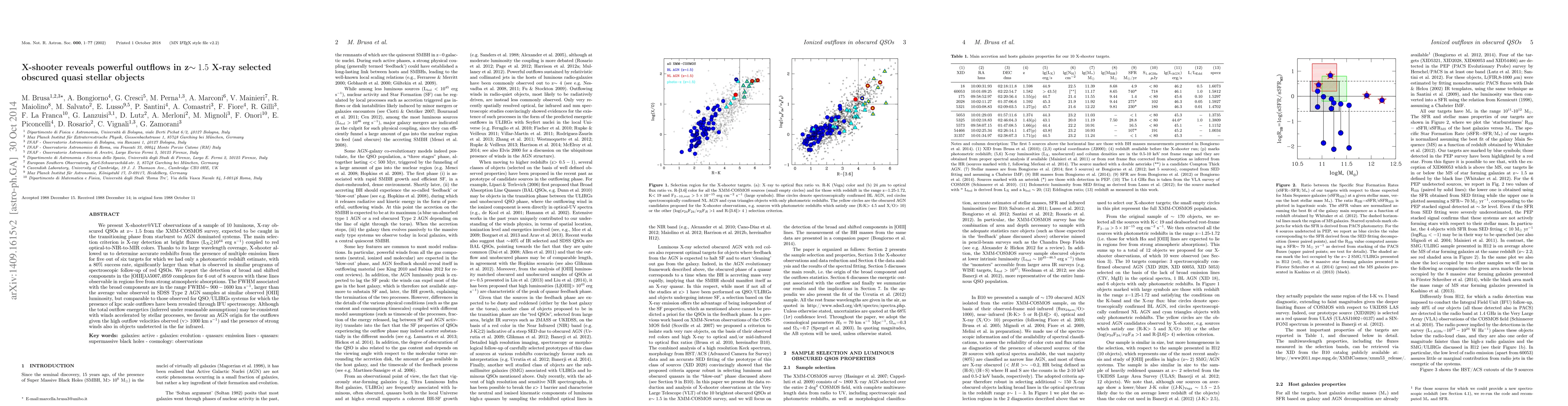 We present X-shooter at the Vewry Large Telescope observations of a sample of 10 luminous, X-ray obscured QSOs at z$\sim1.5$ from the XMM-COSMOS survey, expected to be caught in the transitioning phase from starburst to active galactic nucleus (AGN)-dominated systems. The main selection criterion is X-ray detection at bright fluxes (L$>=10^{44}$ erg s$^{-1}$) coupled to red optical-to-NIR-to-MIR colors. Thanks to its large wavelength coverage, X-shooter allowed us to determine accurate redshifts from the presence of multiple emission lines for five out of six targets for which we had only a photometric redshift estimate, with an 80 percent success rate, significantly larger than what is observed in similar programs of spectroscopic follow-up of red QSOs. We report the detection of broad and shifted components in the [OIII]$\lambda\lambda$5007,4959 complexes for six out of eight sources with these lines observable in regions free from strong atmospheric absorptions. The full width half-maximum (FWHM) associated with the broad components are in the range FWHM$\sim900-1600$ km s$^{-1}$, larger than the average value observed in SDSS Type 2 AGN samples at similar observed [OIII] luminosity, but comparable to those observed for QSO/ultraluminous infrared galaxies systems for which the presence of kpc scale outflows have been revealed through integral field unit spectroscopy. Although the total outflow energetics (inferred under reasonable assumptions) may be consistent with winds accelerated by stellar processes, we favour an AGN origin for the outflows given the high outflow velocities oberved (v$>1000$ km s$^{-1}$) and the presence of strong winds also in objects undetected in the far infrared.