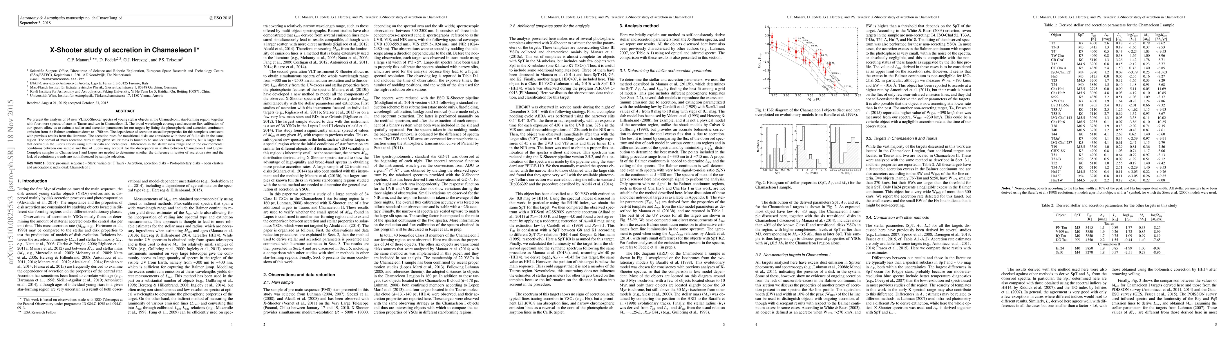 This study analyzes VLT/X-Shooter spectra of young stellar objects to estimate accretion parameters in Chamaeleon I, finding consistent accretion rates for transitional and full disks. The observed scatter in mass accretion rates differs from Lupus, suggesting environmental conditions and sample selection may influence these differences.