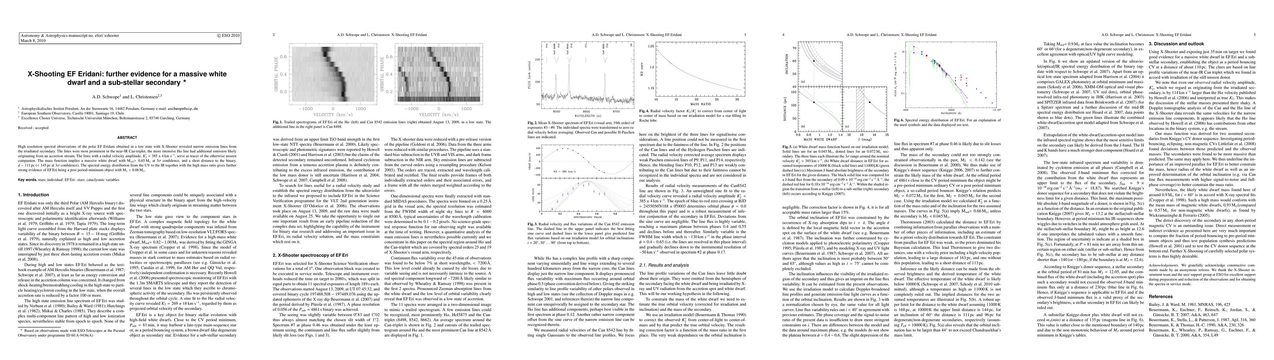 High resolution spectral observations of the polar EF Eridani obtained in a low state with X-Shooter revealed narrow emission lines from the irradiated secondary. The lines were most prominent in the near-IR Ca2-triplet, the more intensive Halpha line had additional emission likely originating from an accretion stream. The lines with a radial velocity amplitude, K2' = 385 +- 4 kmps, serve as tracer of the otherwise unseen companion. The mass function implies a massive white dwarf with Mwd > 0.65 Msun at 3sigma confidence, and a short distance to the binary, d ~ 111 pc (<145pc at 3sigma confidence). The spectral energy distribution from the UV to the IR together with the high mass ratio gives further strong evidence of EF Eri being a post period-minimum object with M2 < 0.06 Msun