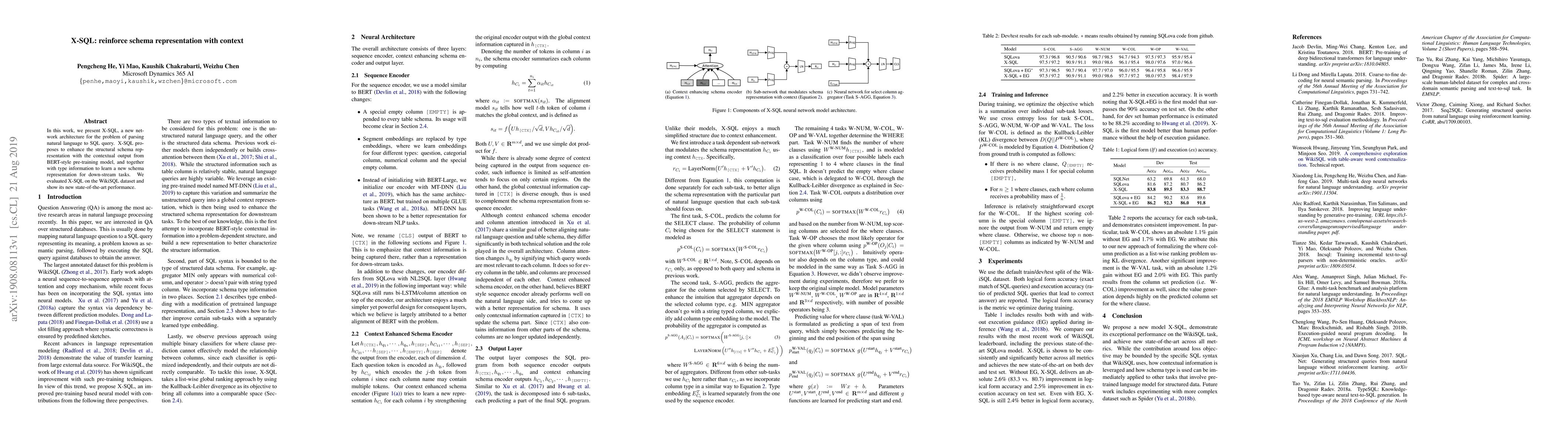 In this work, we present X-SQL, a new network architecture for the problem of parsing natural language to SQL query. X-SQL proposes to enhance the structural schema representation with the contextual output from BERT-style pre-training model, and together with type information to learn a new schema representation for down-stream tasks. We evaluated X-SQL on the WikiSQL dataset and show its new state-of-the-art performance.