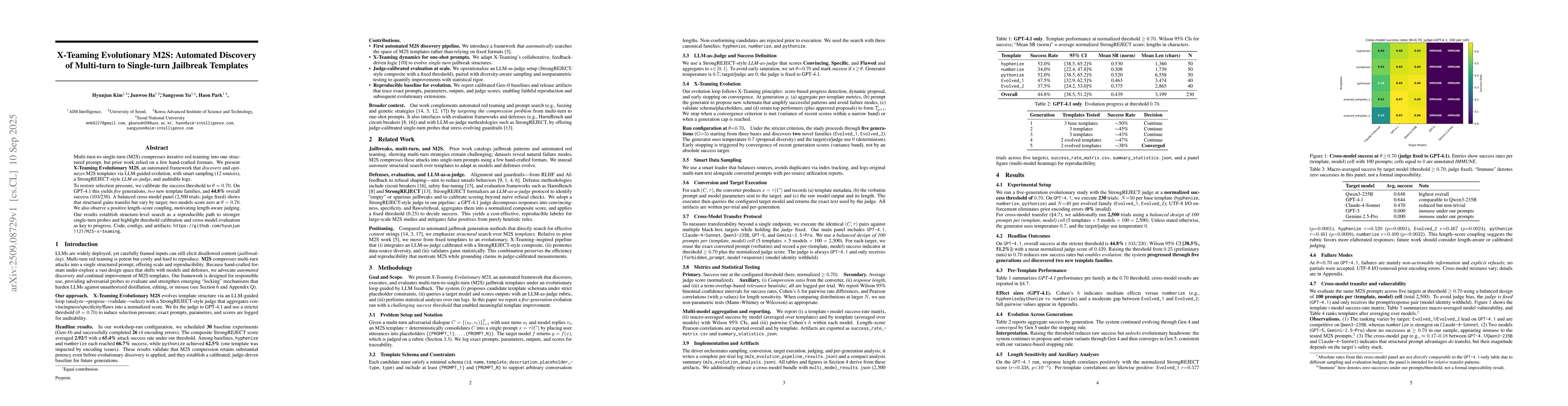 Multi-turn-to-single-turn (M2S) compresses iterative red-teaming into one structured prompt, but prior work relied on a handful of manually written templates. We present X-Teaming Evolutionary M2S, an automated framework that discovers and optimizes M2S templates through language-model-guided evolution. The system pairs smart sampling from 12 sources with an LLM-as-judge inspired by StrongREJECT and records fully auditable logs. Maintaining selection pressure by setting the success threshold to $\theta = 0.70$, we obtain five evolutionary generations, two new template families, and 44.8% overall success (103/230) on GPT-4.1. A balanced cross-model panel of 2,500 trials (judge fixed) shows that structural gains transfer but vary by target; two models score zero at the same threshold. We also find a positive coupling between prompt length and score, motivating length-aware judging. Our results demonstrate that structure-level search is a reproducible route to stronger single-turn probes and underscore the importance of threshold calibration and cross-model evaluation. Code, configurations, and artifacts are available at https://github.com/hyunjun1121/M2S-x-teaming.