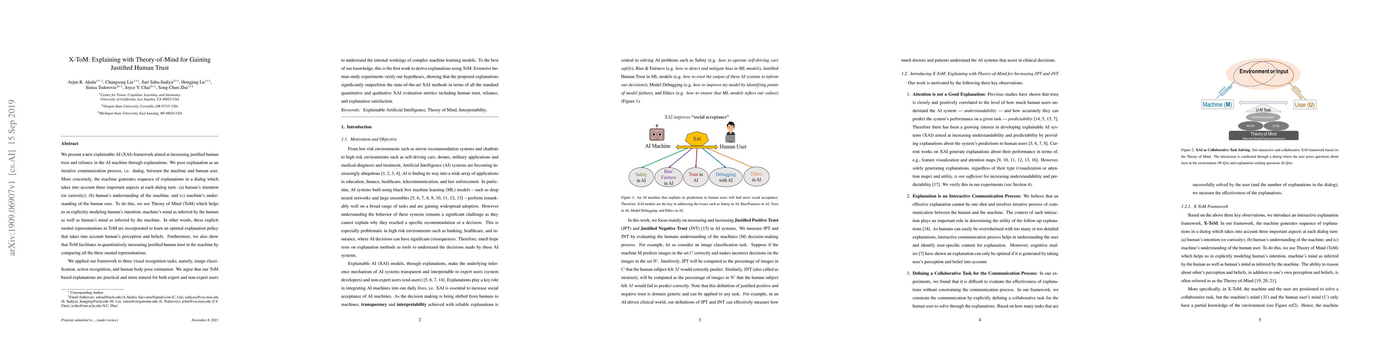 We present a new explainable AI (XAI) framework aimed at increasing justified human trust and reliance in the AI machine through explanations. We pose explanation as an iterative communication process, i.e. dialog, between the machine and human user. More concretely, the machine generates sequence of explanations in a dialog which takes into account three important aspects at each dialog turn: (a) human's intention (or curiosity); (b) human's understanding of the machine; and (c) machine's understanding of the human user. To do this, we use Theory of Mind (ToM) which helps us in explicitly modeling human's intention, machine's mind as inferred by the human as well as human's mind as inferred by the machine. In other words, these explicit mental representations in ToM are incorporated to learn an optimal explanation policy that takes into account human's perception and beliefs. Furthermore, we also show that ToM facilitates in quantitatively measuring justified human trust in the machine by comparing all the three mental representations. We applied our framework to three visual recognition tasks, namely, image classification, action recognition, and human body pose estimation. We argue that our ToM based explanations are practical and more natural for both expert and non-expert users to understand the internal workings of complex machine learning models. To the best of our knowledge, this is the first work to derive explanations using ToM. Extensive human study experiments verify our hypotheses, showing that the proposed explanations significantly outperform the state-of-the-art XAI methods in terms of all the standard quantitative and qualitative XAI evaluation metrics including human trust, reliance, and explanation satisfaction.