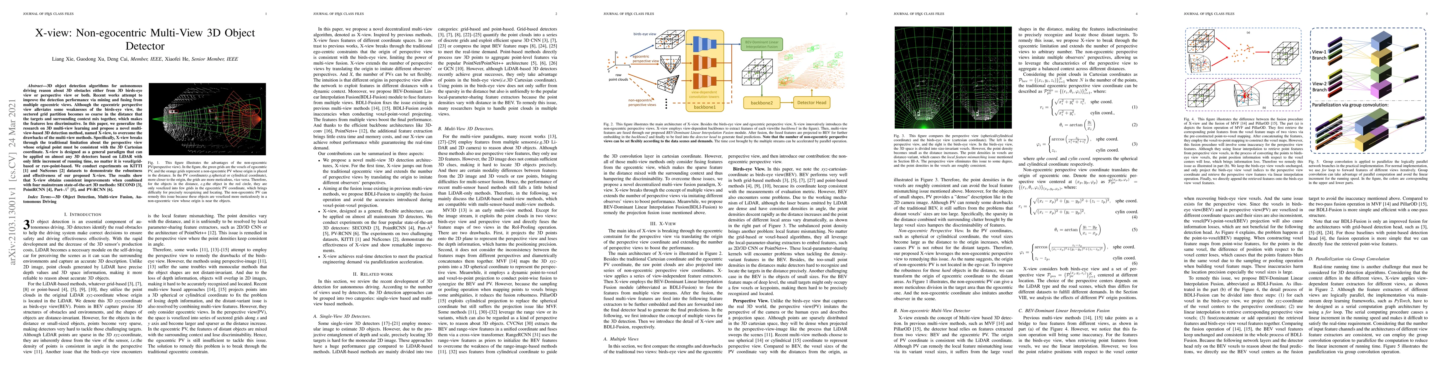 The X-view method introduces a non-egocentric multi-view 3D object detection paradigm that enhances traditional multi-view approaches by eliminating the constraint of a consistent perspective view origin. Experiments on KITTI and NuScenes datasets demonstrate its effectiveness and robustness, consistently improving the performance of several state-of-the-art 3D detectors.
