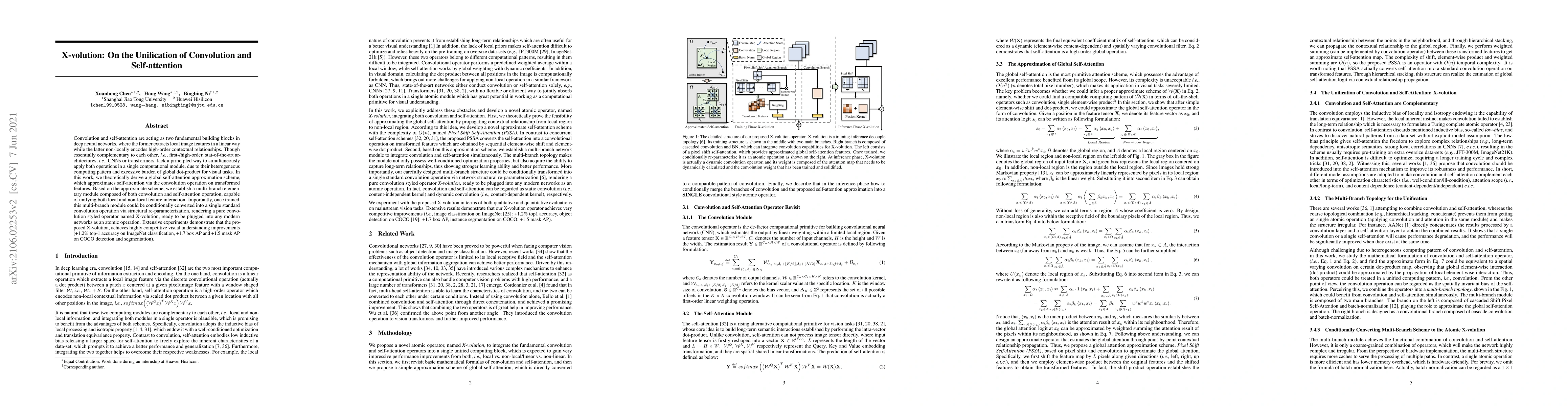 The paper proposes X-volution, a unified module combining convolution and self-attention to extract both local and non-local features efficiently. It achieves competitive performance improvements in visual tasks, demonstrating the potential of integrating these complementary operations into a single computational module.