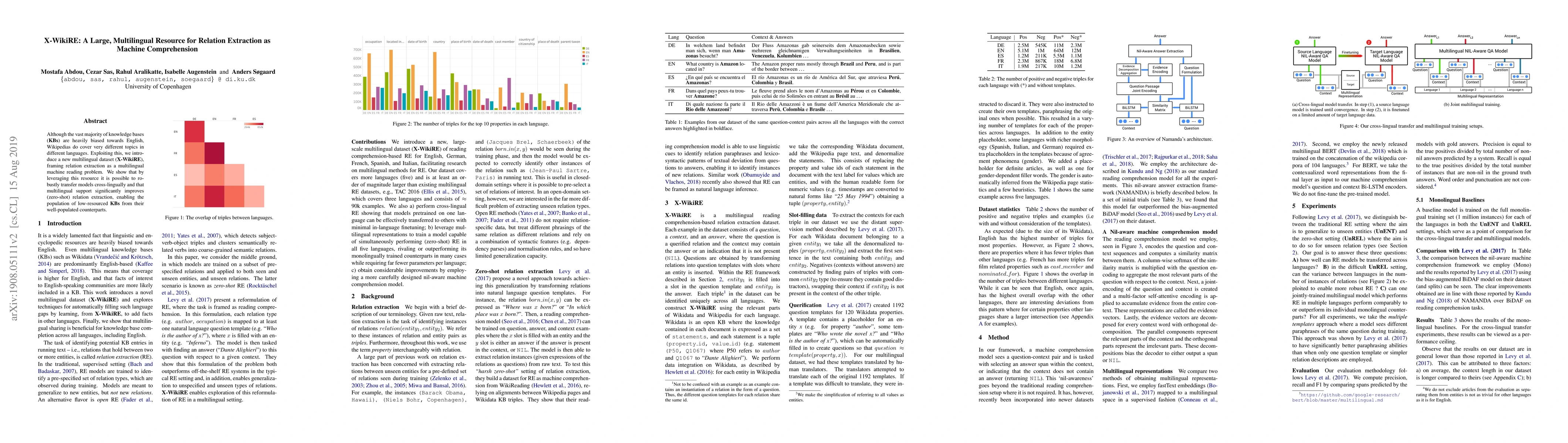 Summary: X-WikiRE is a multilingual dataset designed to frame relation extraction as a machine comprehension task across different languages, demonstrating improved cross-lingual model transfer and zero-shot relation extraction, thus aiding the population of low-resourced knowledge bases.