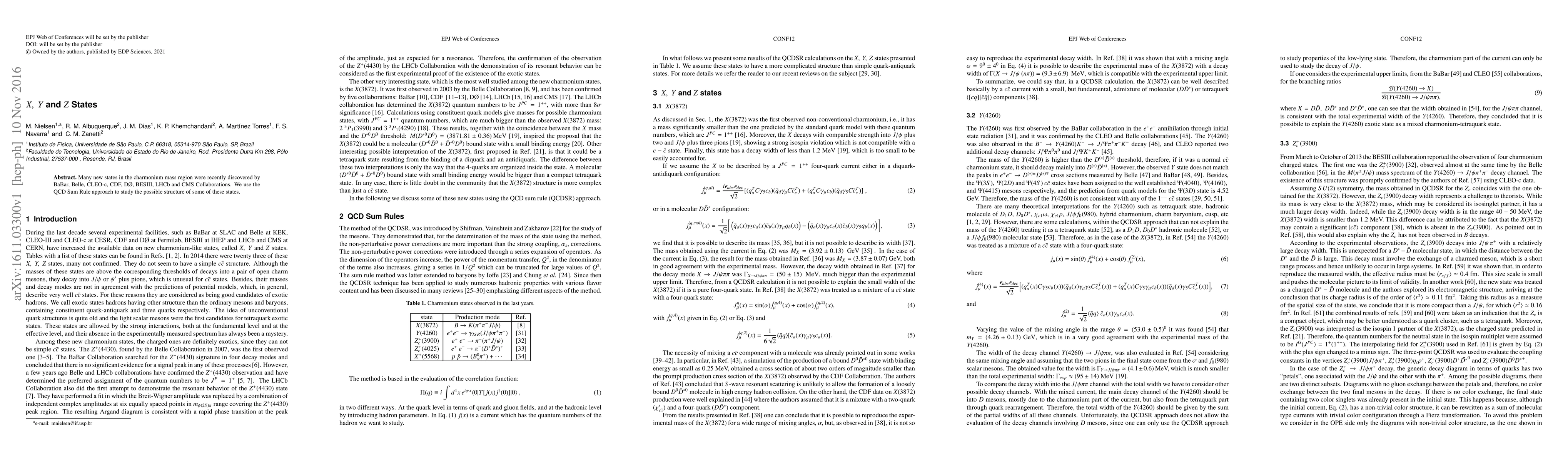 Many new states in the charmonium mass region were recently discovered by BaBar, Belle, CLEO-c, CDF, D0, BESIII, LHCb and CMS Collaborations. We use the QCD Sum Rule approach to study the possible structure of some of these states.