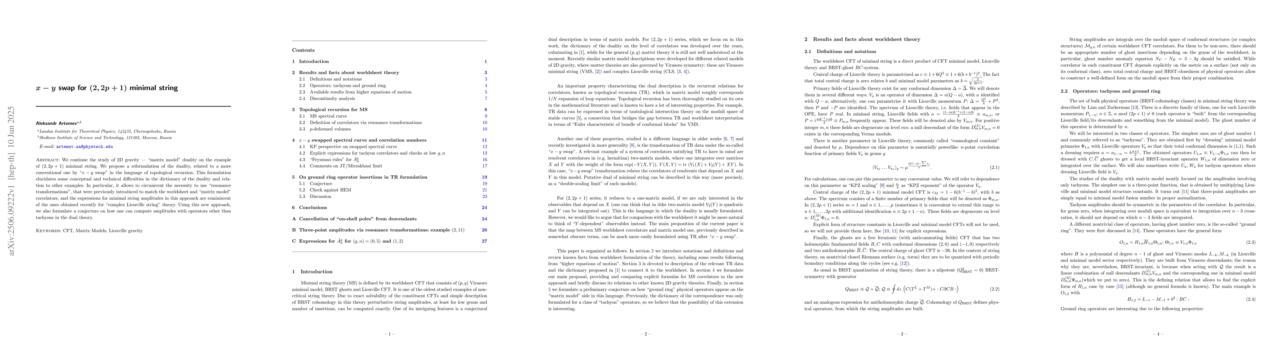 We continue the study of 2D gravity -- ``matrix model'' duality on the example of $(2,2p+1)$ minimal string. We propose a reformulation of the duality, related to a more conventional one by ``$x-y$ swap'' in the language of topological recursion. This formulation elucidates some conceptual and technical difficulties in the dictionary of the duality and relation to other examples. In particular, it allows to circumvent the necessity to use ``resonance transformations'', that were previously introduced to match the worldsheet and ``matrix model'' correlators, and the expressions for minimal string amplitudes in this approach are reminiscent of the ones obtained recently for ``complex Liouville string'' theory. Using this new approach, we also formulate a conjecture on how one can compute amplitudes with operators other than tachyons in the dual theory.