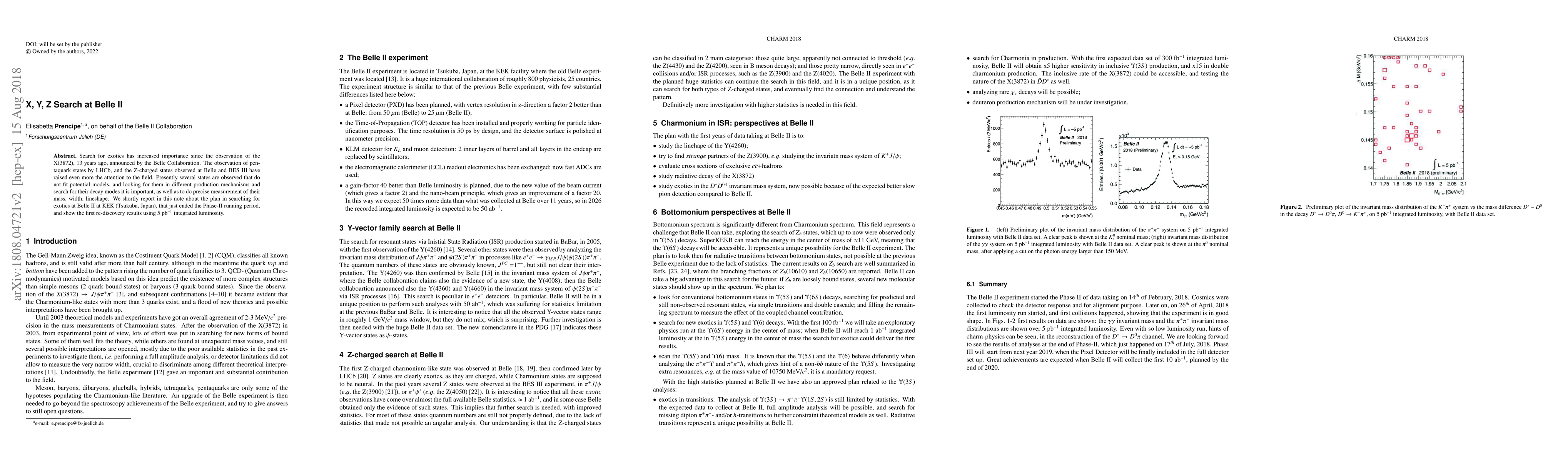 Search for exotics has increased importance since the observation of the X(3872), 13 years ago, announced by the Belle Collaboration. The observation of pentaquark states by LHCb, and the Z-charged states observed at Belle and BES III have raised even more the attention to the field. Presently several states are observed that do not fit potential models, and looking for them in different production mechanisms and search for their decay modes it is important, as well as to do precise measurement of their mass, width, lineshape. We shortly report in this note about the plan in searching for exotics at Belle II at KEK (Tsukuba, Japan), that just ended the Phase-II running period, and show the first re-discovery results using 5 pb$^{-1}$ integrated luminosity.