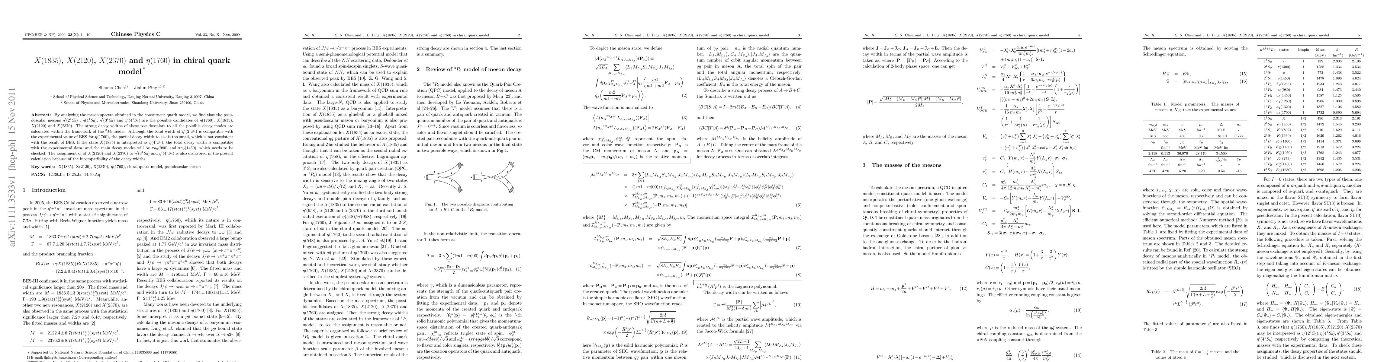 By analyzing the meson spectra obtained in the constituent quark model, we find that the pseudoscalar mesons $\eta'(2^1S_0)$, $\eta(4^1S_0)$, $\eta'(3^1S_0)$ and $\eta'(4^1S_0)$ are the possible candidates of $\eta(1760)$, X(1835), X(2120) and X(2370). The strong decay widths of these pseudoscalars to all the possible decay modes are calculated within the framework of the $^3P_0$ model. Although the total width of $\eta'(2^1S_0)$ is compatible with the experimental value of BES for $\eta(1760)$, the partial decay width to $\omega\omega$ is too small, which is not consistent with the result of BES. If the state X(1835) is interpreted as $\eta(4^1S_0)$, the total decay width is compatible with the experimental data, and the main decay modes will be $\pi a_0(980)$ and $\pi a_0(1450)$, which needs to be checked. The assignment of X(2120) and X(2370) to $\eta'(3^1S_0)$ and $\eta'(4^1S_0)$ is also disfavored in the present calculation because of the incompatibility of the decay widths.