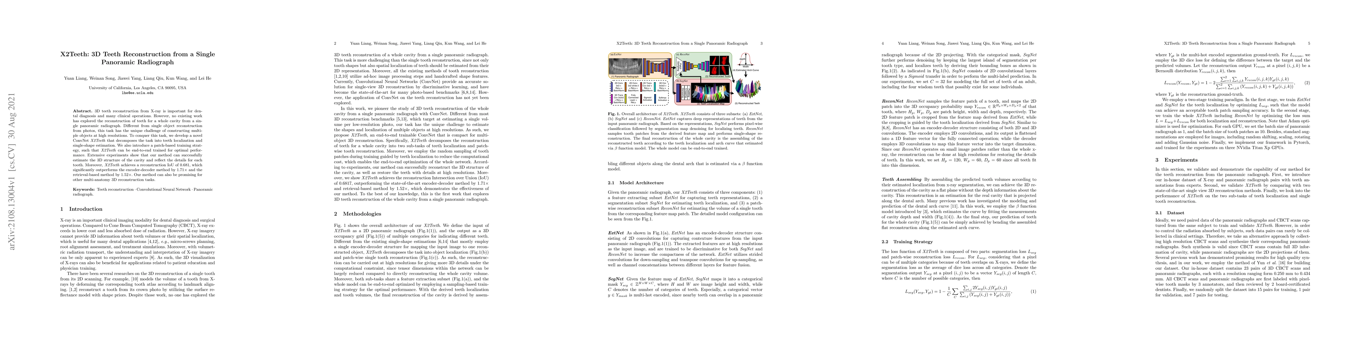 The X2Teeth ConvNet reconstructs 3D teeth structures from a single panoramic radiograph, achieving high-resolution multi-object reconstruction. It outperforms existing methods with a reconstruction IoU of 0.681, demonstrating potential for broader multi-anatomy 3D reconstruction applications.