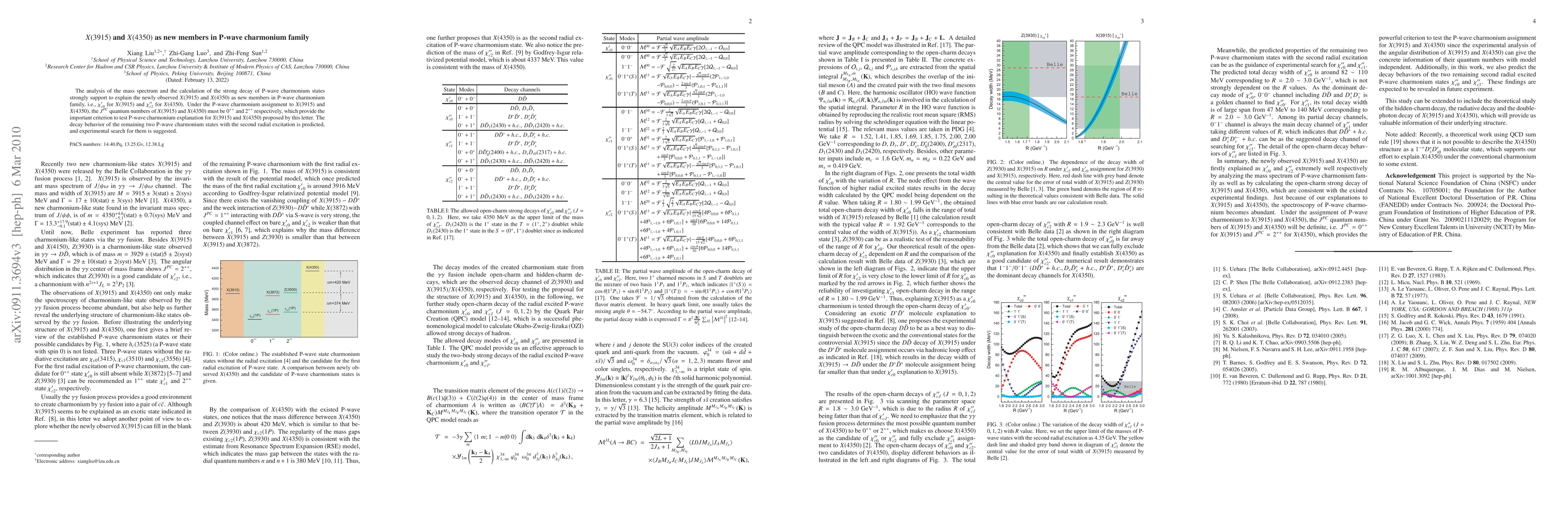 This paper proposes that the newly observed X(3915) and X(4350) are new members of the P-wave charmonium family, specifically $\chi_{c0}^\prime$ and $\chi_{c2}^{\prime\prime}$ respectively, based on their mass spectrum and strong decay calculations. The study suggests their $J^{PC}$ quantum numbers as $0^{++}$ and $2^{++}$ and predicts the decay behavior of other second radial excitation P-wave charmonium states.