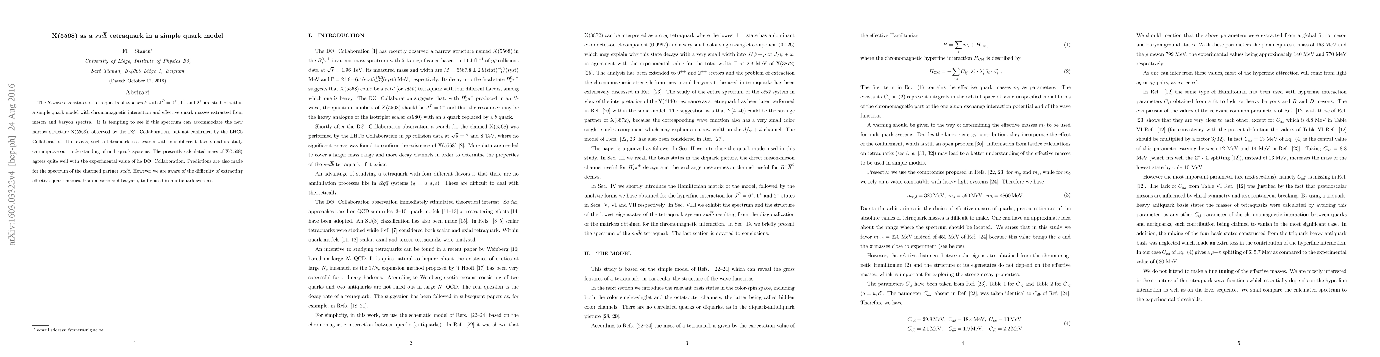 The $S$-wave eigenstates of tetraquarks of type $s u \bar d \bar b$ with J$^{P}$ = 0$^{+}$, 1$^{+}$ and 2$^{+}$ are studied within a simple quark model with chromomagnetic interaction and effective quark masses extracted from meson and baryon spectra. It is tempting to see if this spectrum can accommodate the new narrow structure X(5568), observed by the D\O~~Collaboration, but not confirmed by the LHCb Collaboration. If it exists, such a tetraquark is a system with four different flavors and its study can improve our understanding of multiquark systems. The presently calculated mass of X(5568) agrees quite well with the experimental value of he D\O~~Collaboration. Predictions are made for the spectrum of the charmed partner $s u \bar d \bar c$. However we are aware of the difficulty of extracting effective quark masses, from mesons and baryons, to be used in multiquark systems.