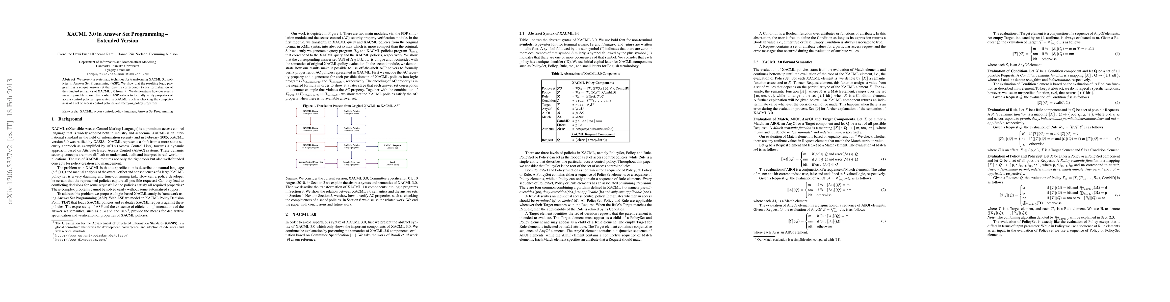 This paper proposes a method to translate XACML 3.0 access control policies into Answer Set Programming (ASP), ensuring a unique answer set that aligns with the standard XACML semantics. The technique enables the use of ASP solvers to verify properties like policy completeness and other access control attributes.