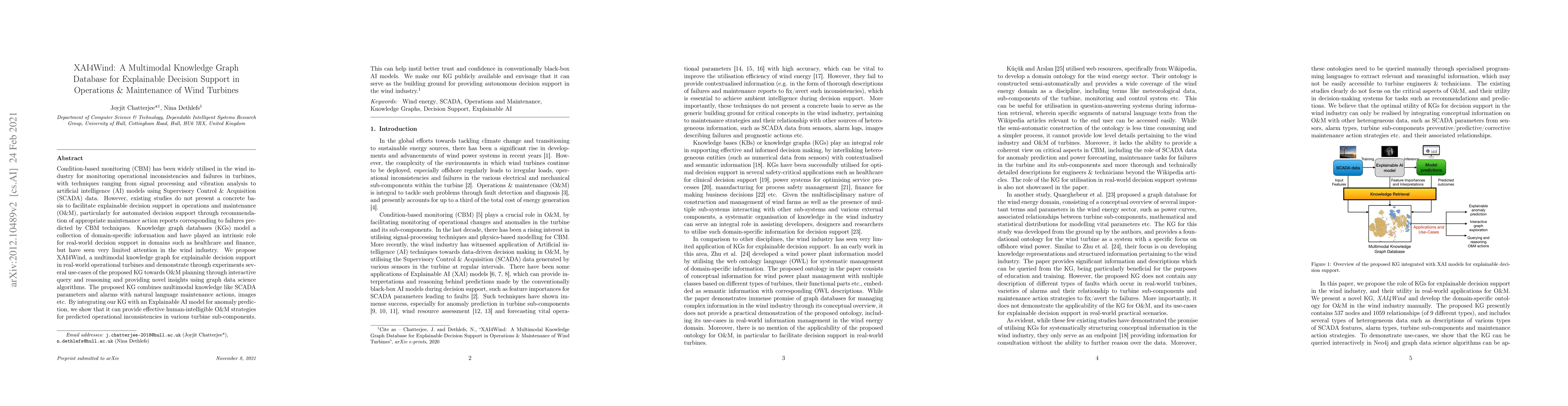 XAI4Wind introduces a multimodal knowledge graph database to enhance explainable decision support in wind turbine operations and maintenance, integrating SCADA data, alarms, and natural language maintenance actions. The proposed system aims to provide transparent, human-intelligible strategies for maintenance actions based on AI-predicted anomalies, fostering trust in AI models.