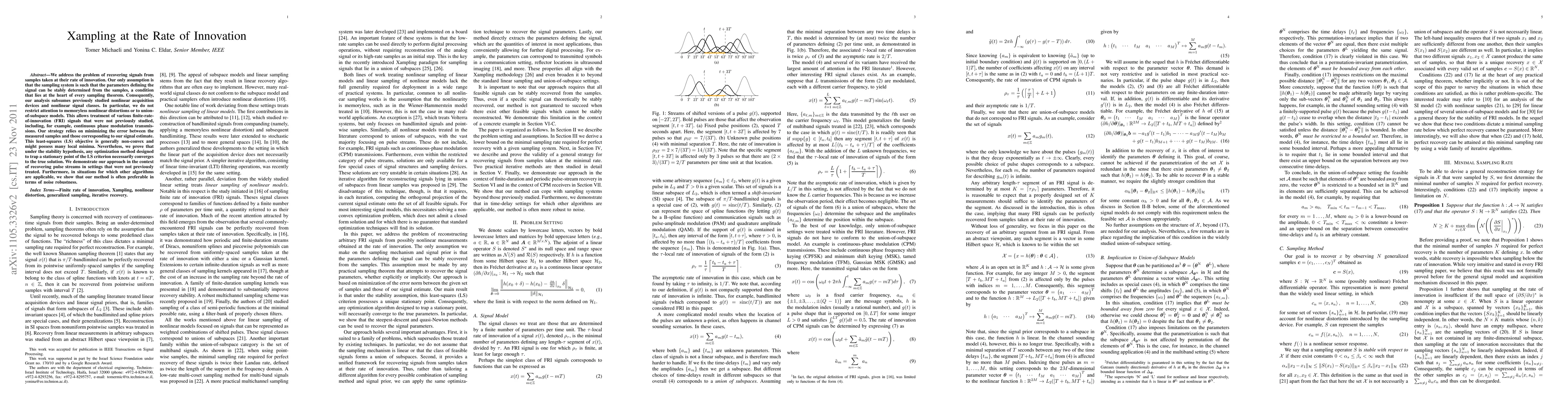 We address the problem of recovering signals from samples taken at their rate of innovation. Our only assumption is that the sampling system is such that the parameters defining the signal can be stably determined from the samples, a condition that lies at the heart of every sampling theorem. Consequently, our analysis subsumes previously studied nonlinear acquisition devices and nonlinear signal classes. In particular, we do not restrict attention to memoryless nonlinear distortions or to union-of-subspace models. This allows treatment of various finite-rate-of-innovation (FRI) signals that were not previously studied, including, for example, continuous phase modulation transmissions. Our strategy relies on minimizing the error between the measured samples and those corresponding to our signal estimate. This least-squares (LS) objective is generally non-convex and might possess many local minima. Nevertheless, we prove that under the stability hypothesis, any optimization method designed to trap a stationary point of the LS criterion necessarily converges to the true solution. We demonstrate our approach in the context of recovering pulse streams in settings that were not previously treated. Furthermore, in situations for which other algorithms are applicable, we show that our method is often preferable in terms of noise robustness.