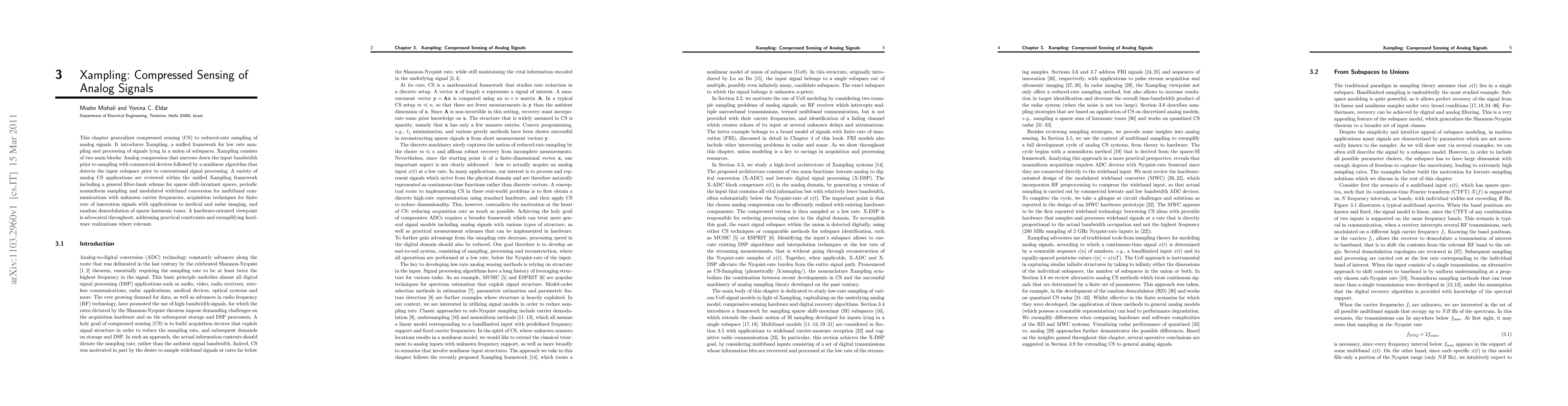 Xampling presents a unified framework for reduced-rate sampling and processing of signals in union of subspaces, combining analog compression with nonlinear algorithms for subspace detection before conventional signal processing.