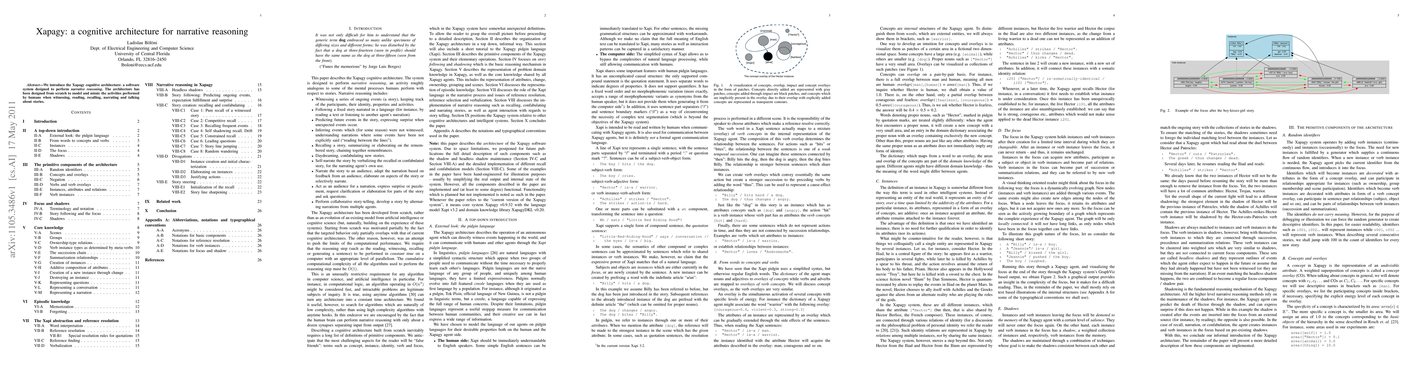 Summary: Xapagy is a novel cognitive architecture aimed at enabling narrative reasoning, designed to model human activities related to stories, including witnessing, reading, recalling, narrating, and discussing them. It seeks to mimic the cognitive processes involved in these narrative interactions.