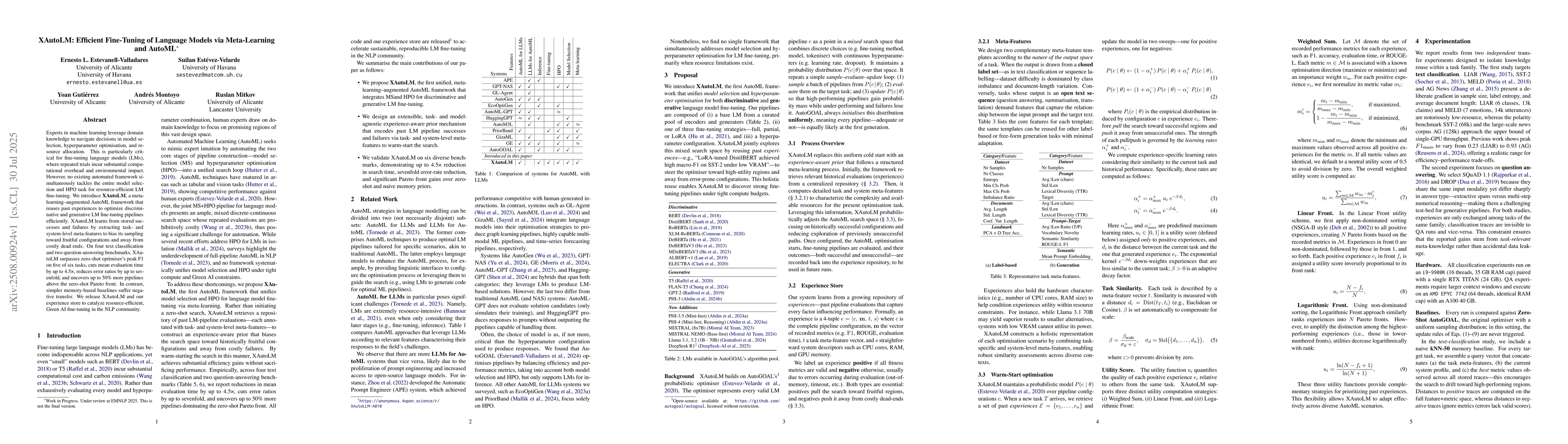 Experts in machine learning leverage domain knowledge to navigate decisions in model selection, hyperparameter optimisation, and resource allocation. This is particularly critical for fine-tuning language models (LMs), where repeated trials incur substantial computational overhead and environmental impact. However, no existing automated framework simultaneously tackles the entire model selection and HPO task for resource-efficient LM fine-tuning. We introduce XAutoLM, a meta-learning-augmented AutoML framework that reuses past experiences to optimise discriminative and generative LM fine-tuning pipelines efficiently. XAutoLM learns from stored successes and failures by extracting task- and system-level meta-features to bias its sampling toward fruitful configurations and away from costly dead ends. On four text classification and two question-answering benchmarks, XAutoLM surpasses zero-shot optimiser's peak F1 on five of six tasks, cuts mean evaluation time by up to 4.5x, reduces error ratios by up to sevenfold, and uncovers up to 50% more pipelines above the zero-shot Pareto front. In contrast, simpler memory-based baselines suffer negative transfer. We release XAutoLM and our experience store to catalyse resource-efficient, Green AI fine-tuning in the NLP community.