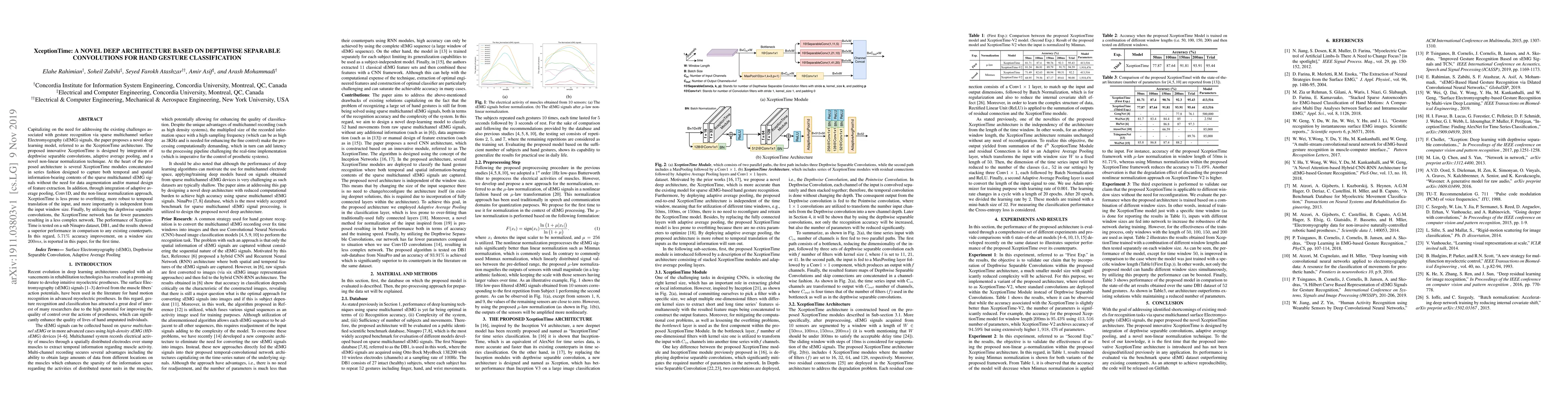 Capitalizing on the need for addressing the existing challenges associated with gesture recognition via sparse multichannel surface Electromyography (sEMG) signals, the paper proposes a novel deep learning model, referred to as the XceptionTime architecture. The proposed innovative XceptionTime is designed by integration of depthwise separable convolutions, adaptive average pooling, and a novel non-linear normalization technique. At the heart of the proposed architecture is several XceptionTime modules concatenated in series fashion designed to capture both temporal and spatial information-bearing contents of the sparse multichannel sEMG signals without the need for data augmentation and/or manual design of feature extraction. In addition, through integration of adaptive average pooling, Conv1D, and the non-linear normalization approach, XceptionTime is less prone to overfitting, more robust to temporal translation of the input, and more importantly is independent from the input window size. Finally, by utilizing the depthwise separable convolutions, the XceptionTime network has far fewer parameters resulting in a less complex network. The performance of XceptionTime is tested on a sub Ninapro dataset, DB1, and the results showed a superior performance in comparison to any existing counterparts. In this regard, 5:71% accuracy improvement, on a window size 200ms, is reported in this paper, for the first time.