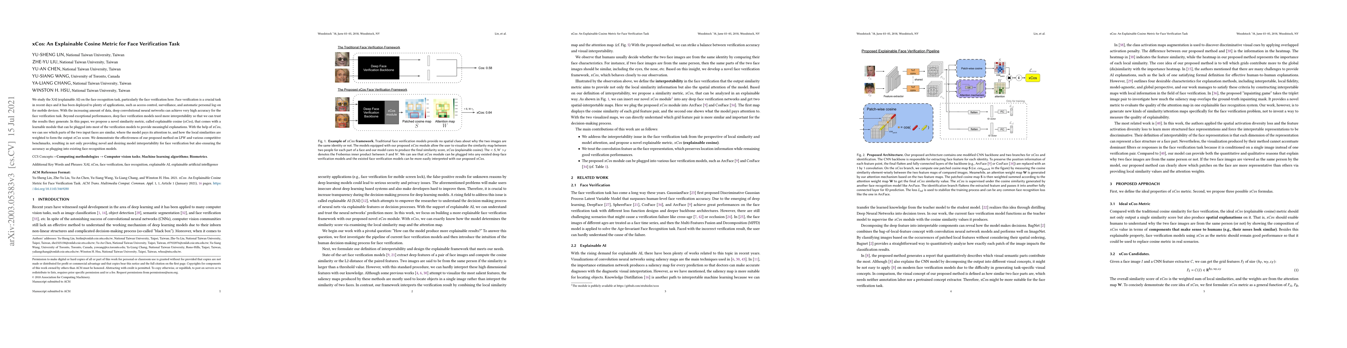 This paper introduces an explainable cosine metric ($xCos$) for face verification, enhancing model interpretability by detailing which facial features contribute to the similarity score. The proposed method maintains high accuracy while providing insights into model decision-making, demonstrated through benchmarks like LFW.
