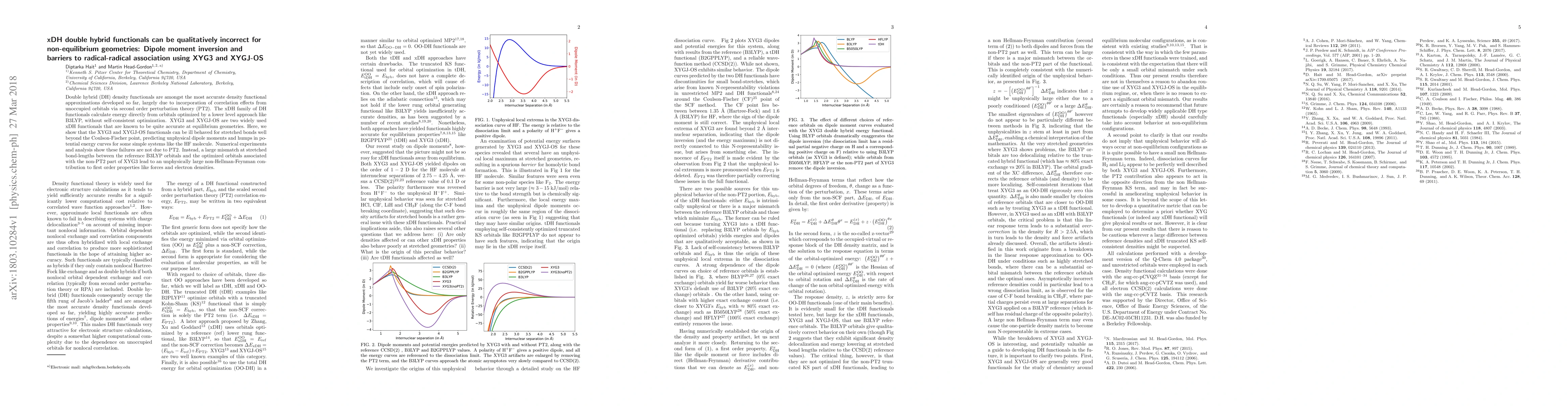 Double hybrid functionals like XYG3 and XYGJ-OS can produce incorrect results for non-equilibrium geometries, predicting unphysical dipole moments and energy humps in molecules.