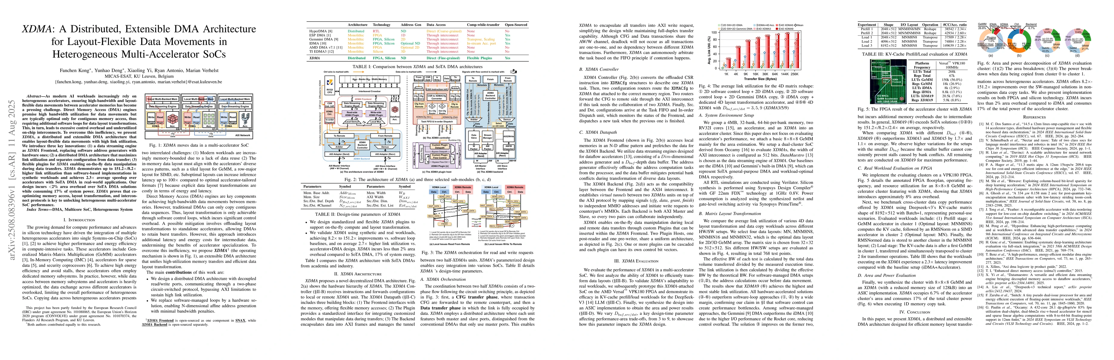 As modern AI workloads increasingly rely on heterogeneous accelerators, ensuring high-bandwidth and layout-flexible data movements between accelerator memories has become a pressing challenge. Direct Memory Access (DMA) engines promise high bandwidth utilization for data movements but are typically optimal only for contiguous memory access, thus requiring additional software loops for data layout transformations. This, in turn, leads to excessive control overhead and underutilized on-chip interconnects. To overcome this inefficiency, we present XDMA, a distributed and extensible DMA architecture that enables layout-flexible data movements with high link utilization. We introduce three key innovations: (1) a data streaming engine as XDMA Frontend, replacing software address generators with hardware ones; (2) a distributed DMA architecture that maximizes link utilization and separates configuration from data transfer; (3) flexible plugins for XDMA enabling on-the-fly data manipulation during data transfers. XDMA demonstrates up to 151.2x/8.2x higher link utilization than software-based implementations in synthetic workloads and achieves 2.3x average speedup over accelerators with SoTA DMA in real-world applications. Our design incurs <2% area overhead over SoTA DMA solutions while consuming 17% of system power. XDMA proves that co-optimizing memory access, layout transformation, and interconnect protocols is key to unlocking heterogeneous multi-accelerator SoC performance.