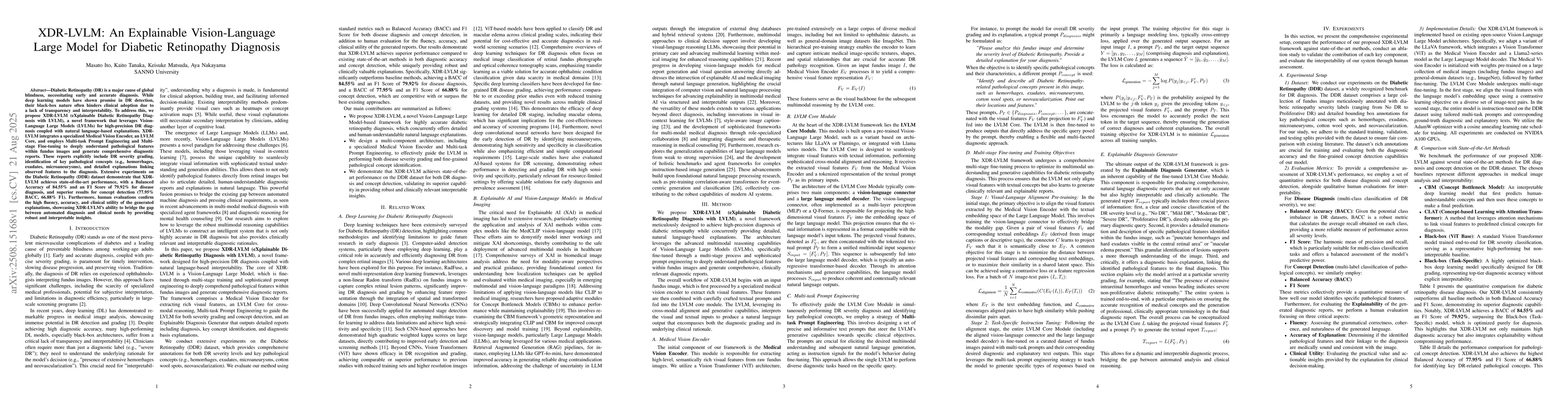 Diabetic Retinopathy (DR) is a major cause of global blindness, necessitating early and accurate diagnosis. While deep learning models have shown promise in DR detection, their black-box nature often hinders clinical adoption due to a lack of transparency and interpretability. To address this, we propose XDR-LVLM (eXplainable Diabetic Retinopathy Diagnosis with LVLM), a novel framework that leverages Vision-Language Large Models (LVLMs) for high-precision DR diagnosis coupled with natural language-based explanations. XDR-LVLM integrates a specialized Medical Vision Encoder, an LVLM Core, and employs Multi-task Prompt Engineering and Multi-stage Fine-tuning to deeply understand pathological features within fundus images and generate comprehensive diagnostic reports. These reports explicitly include DR severity grading, identification of key pathological concepts (e.g., hemorrhages, exudates, microaneurysms), and detailed explanations linking observed features to the diagnosis. Extensive experiments on the Diabetic Retinopathy (DDR) dataset demonstrate that XDR-LVLM achieves state-of-the-art performance, with a Balanced Accuracy of 84.55% and an F1 Score of 79.92% for disease diagnosis, and superior results for concept detection (77.95% BACC, 66.88% F1). Furthermore, human evaluations confirm the high fluency, accuracy, and clinical utility of the generated explanations, showcasing XDR-LVLM's ability to bridge the gap between automated diagnosis and clinical needs by providing robust and interpretable insights.