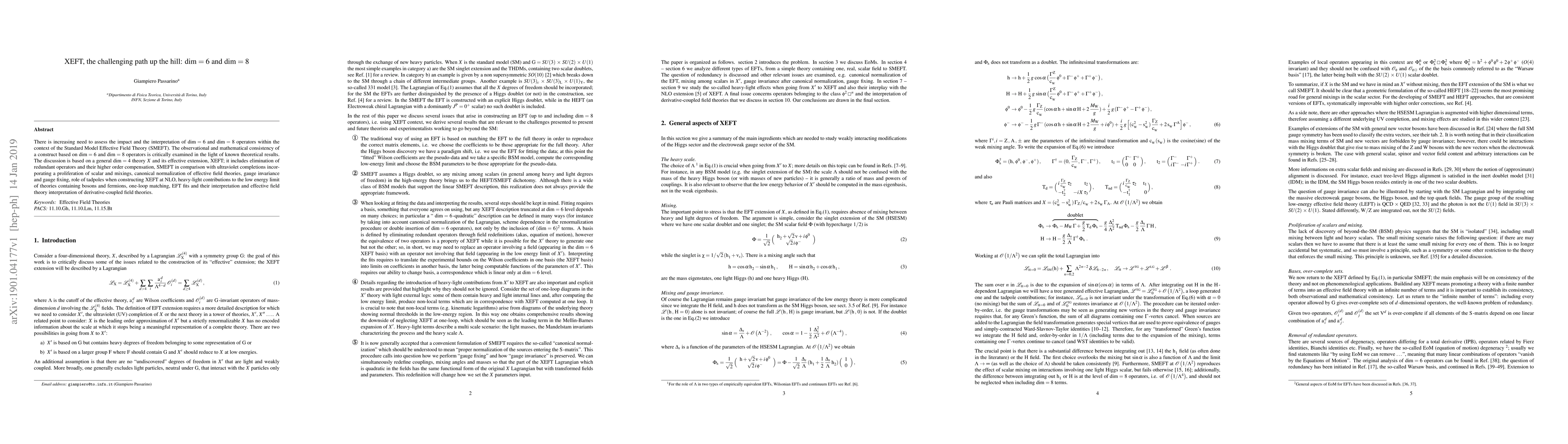 There is increasing need to assess the impact and the interpretation of dim = 6 and dim = 8 operators within the context of the Standard Model Effective Field Theory (SMEFT). The observational and mathematical consistency of a construct based on dim = 6 and dim = 8 operators is critically examined in the light of known theoretical results. The discussion is based on a general dim = 4 theory X and its effective extension, XEFT; it includes elimination of redundant operators and their higher order compensation, SMEFT in comparison with ultraviolet completions incorporating a proliferation of scalar and mixings, canonical normalization of effective field theories, gauge invariance and gauge fixing, role of tadpoles when constructing XEFT at NLO, heavy-light contributions to the low energy limit of theories containing bosons and fermions, one-loop matching, EFT fits and their interpretation and effective field theory interpretation of derivative-coupled field theories.