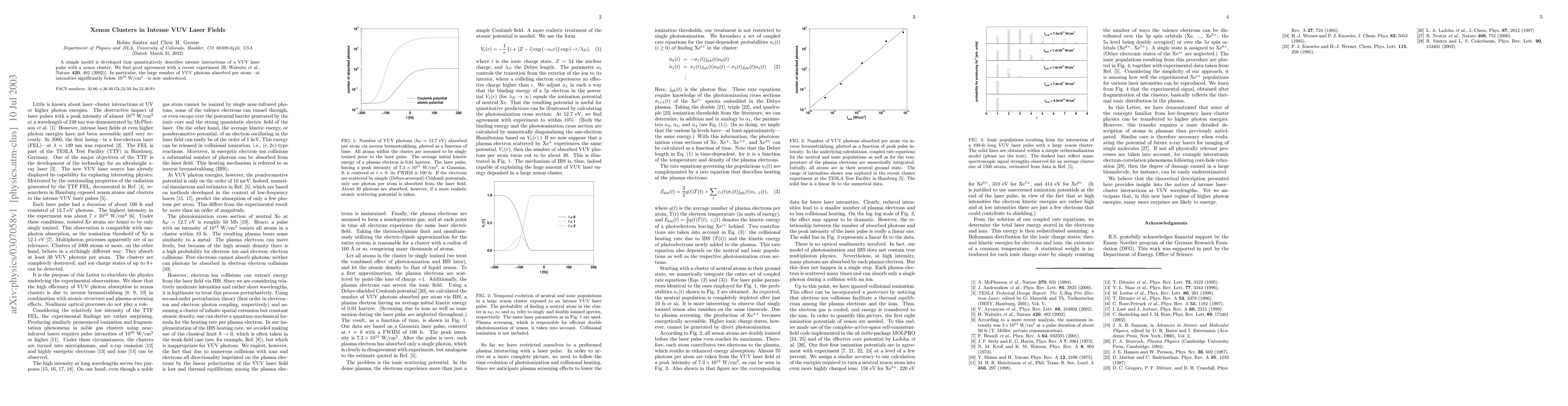 This paper develops a model to quantitatively describe the interaction of intense VUV laser pulses with xenon clusters, showing good agreement with recent experimental results. The model explains the absorption of a large number of VUV photons per atom at intensities below 10^16 W/cm^2.